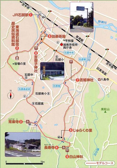 東海道石部宿 JR石部駅 ⇒ 吉御子神社 ⇒ 歴史民族資料館 ⇒ 常楽寺 ⇒ じゅらくの里(昼食)⇒ |--- 1.0km ---|-----1.4km----|----2.5km----|----1.2km----|------ ⇒⇒長寿寺・白山神社 ⇒ 上葦穂神社 ⇒ 吉姫神社 ⇒ 本陣跡 ⇒ JR石部駅 -0.3km----|-------2.3km-----|----1.0km----|---0.8km---|--1.1km--| |