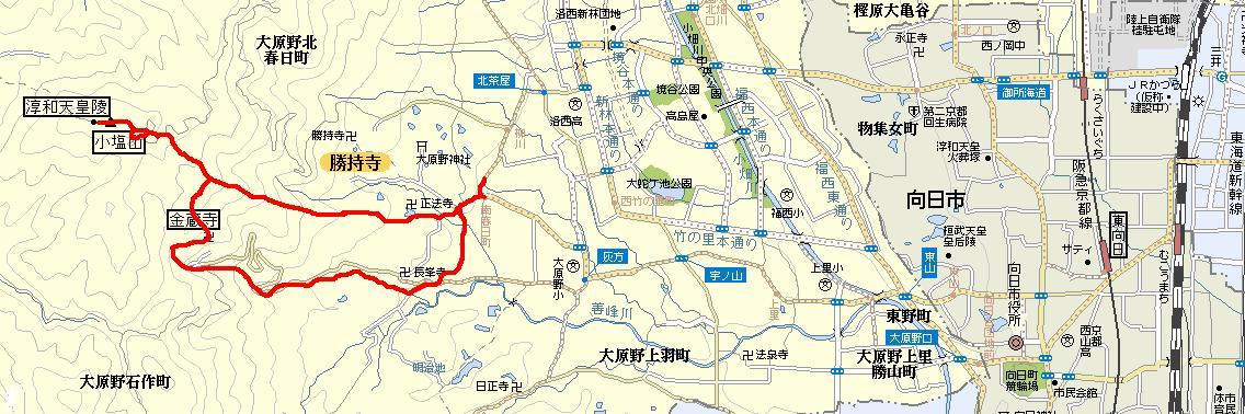 阪急・東向日駅――南春日町バス停⇒小塩山登山道⇒金蔵寺分れ道⇒淳和天皇陵 |-------バス-------|----------2.0Km----------|-----1.8Km----|-- ⇒⇒鉄塔下(昼食)⇒金蔵寺⇒入亀山不動堂⇒樫本神社⇒南春日町バス停・解散 --0.2Km--|--1.2km--|--0.5km--|--1.5km--|-----0.3km-----| |