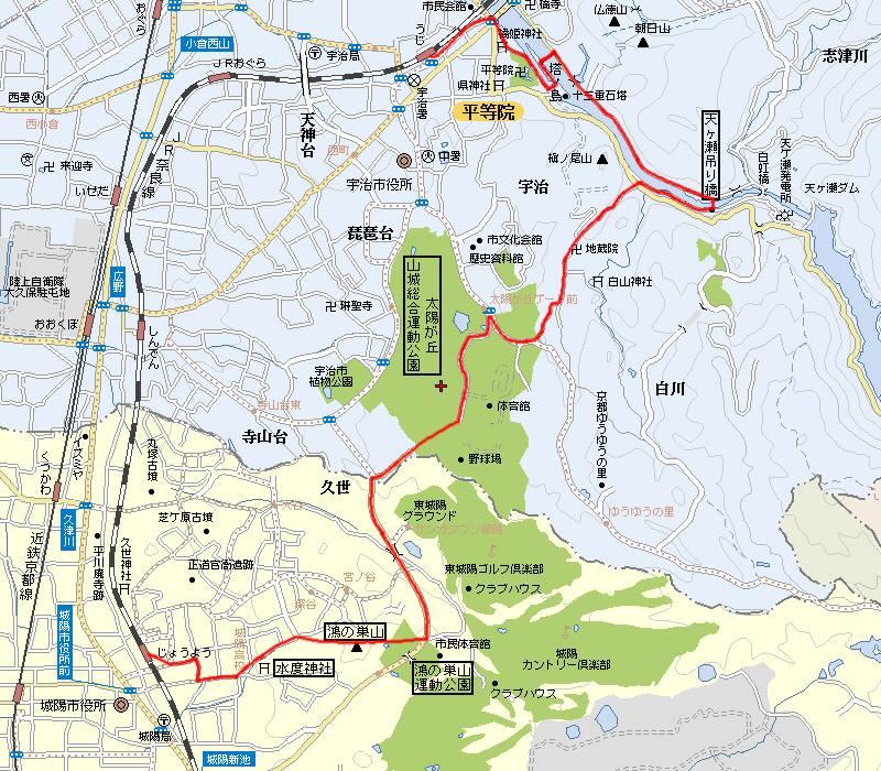 JR宇治駅⇒塔の島⇒天ヶ瀬吊り橋⇒白川郷⇒太陽が丘 (昼食)⇒鴻ノ巣山運動公園 |→1.2k→|→1.8k→|→→ 2.6k →→|→→ 2.1k →→|→ 0.6k → ⇒鴻ノ巣山展望台⇒水度神社⇒JR城陽駅(解散) →→|→ 0.6k →|→ 1.6k →| |