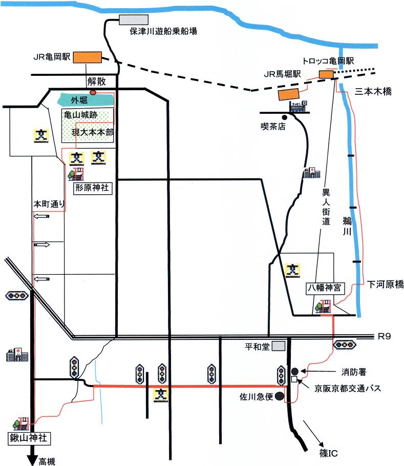 JR馬堀駅 ⇒ トロッコ亀岡駅 ⇒ 八幡神宮 ⇒ 鍬山神社(昼食) ⇒ |→→ 0.2K ←←|→→ 1.9K ←←|→→ 4.0K ←←|→→ ⇒ 形原神社 ⇒ 亀山城跡 ⇒ 南郷公園(解散) 2.4K ←←|→→ 0.2K ←←|→→ 0.3K ←←| |