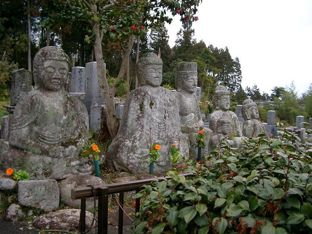 ☆胞衣塚(えなづか): 三尾里集落の南、平地に築かれた円墳。6世紀の築造と推定される。「胞衣」 (えな)とは胎盤のことで、オホド王(継体天皇)出産の折りの胎盤をここに埋めたという伝承がある。 ☆玉 泉 寺 : 境内には五知如来石仏がある。このあたりは西方浄土に最も近いと思われていた阿弥陀山があることから、石造の建造物や石仏群が多いらしい。 石仏は、向かって左から、阿弥陀如来、薬師如来、大日如来、弥勒仏、釈迦如来の五体。室町時代後期の作品で、鵜川の四十八体石仏と同時期と推定されている。 ☆三重生(みおう)神社: 祭神は継体天皇の両親の彦主人(ひこうし)王と振媛(ふるひめ)。背後の台地には陵墓伝承地として宮内庁管轄の王塚古墳がある。 ☆安産もたれ石: 彦主人王に天成神道を教授した山崎命の創祀と言われる三尾神社旧跡に、彦主人王の后である振姫が産屋を構えた折、振姫がもたれた と伝わるのがこの「もたれ石」。妊婦がこの石を撫でてから自分のお腹をさすり、安産を願う習慣がある。 ☆彦主人王(ひこうしおう)御陵: うっそうとした檜並木の参道の奥にある通称“王塚”と呼ばれる古墳の中 にある。2段重ねの円墳で、周囲の古墳より規模が大きく、古墳時代中期のものと考えられている。 |