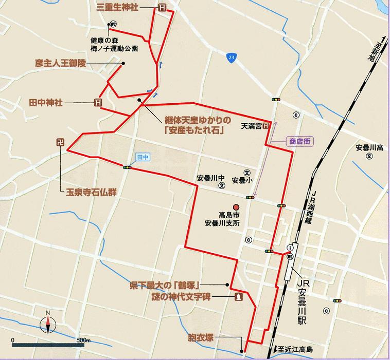 JR安曇川駅⇒胞衣塚⇒神代文字碑⇒鶴塚⇒玉泉寺石仏群⇒三重生神社 |----0.9km----|--0.6km--|-----2.1km-----|----1.6km----|---- ⇒梅の子運動公園(昼食)⇒安産もたれ石⇒彦主人王御陵⇒田中神社⇒安曇川駅(解散) --0.5km----|---- 0.7km ----|-----0.4km-----|----0.3km----|--2.4km---解散 |