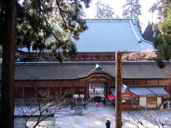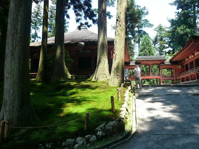 ☆ にない堂: 常行堂と法華堂という同じ形の建物が二つ並んで渡り廊下でつながっている。力持ちの弁慶が この渡り廊下を天秤棒にしてこのお堂を担いだという伝説から弁慶のにない堂と呼ばれている。 ☆ 釈迦堂: 伝教大師ご自作の釈迦如来を本尊とし西塔の中心をなすお堂で老杉の立木と共に堂々とした風格を持っている。 信長の焼き討ち後、豊臣秀吉が大津の三井寺から移したもので天台建築様式の代表とされる山内最古の建物。 ☆ 阿弥陀堂: 1937年に比叡山開創1150年大法要を記念して建てられた。ここは滅罪回向の道場で本尊に 阿弥陀如来をまつり、ご参拝の皆様が施主となって日々念仏回向が行われている。 ☆ 大講堂: 僧侶が法華教の講義を聴いたりお互いに問答をして勉強する学問修行の道場。本尊は大日如来をまつり、 また比叡山で修行をして一宗の開祖となられた法然、親鸞、栄西、道元、日蓮などの等身大の尊像が安置されている。 ☆ 根本中堂: 国宝の根本中堂は延暦寺の総本堂。伝教大師のご自作の本尊薬師如来像の前には「不滅の法灯」が開創以来1200年間 消えることなく灯り続けている。内陣が参拝者のいる中陣・外陣より低い位置にあり、本尊や法灯が参拝者の目の高さに きているのは仏も人もひとつという仏教の「仏凡一如」の考えを表している。 |