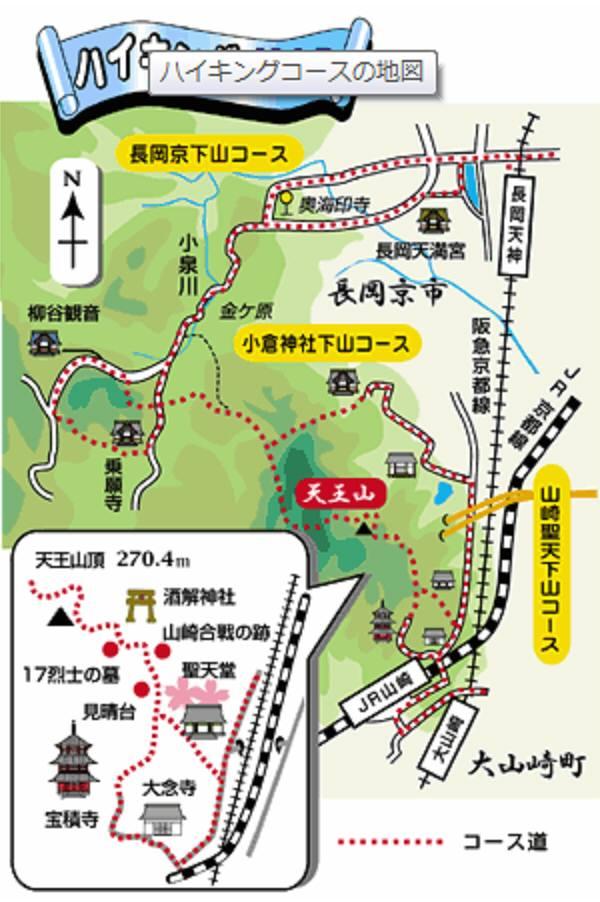 JR山崎駅⇒宝積寺⇒旗立松展望台⇒酒解神社⇒天王山⇒楊谷寺⇒阪急長岡京駅・解散 |--0.6km--|--1.0km--|---0.6km---|--0.3km--|--3.0km--|---3.8km---| |
