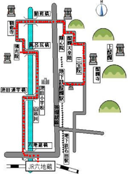 JR六地蔵駅 ⇒佛光院 ⇒勧修寺 ⇒随心院 ⇒醍醐天皇後山科陵 ⇒醍醐寺北門 |---4,5k---|---0,3k--|---0.9k---|-----0.7k-----|----0,7k----|---- 地下鉄醍醐駅(解散) ---1.4K----| |