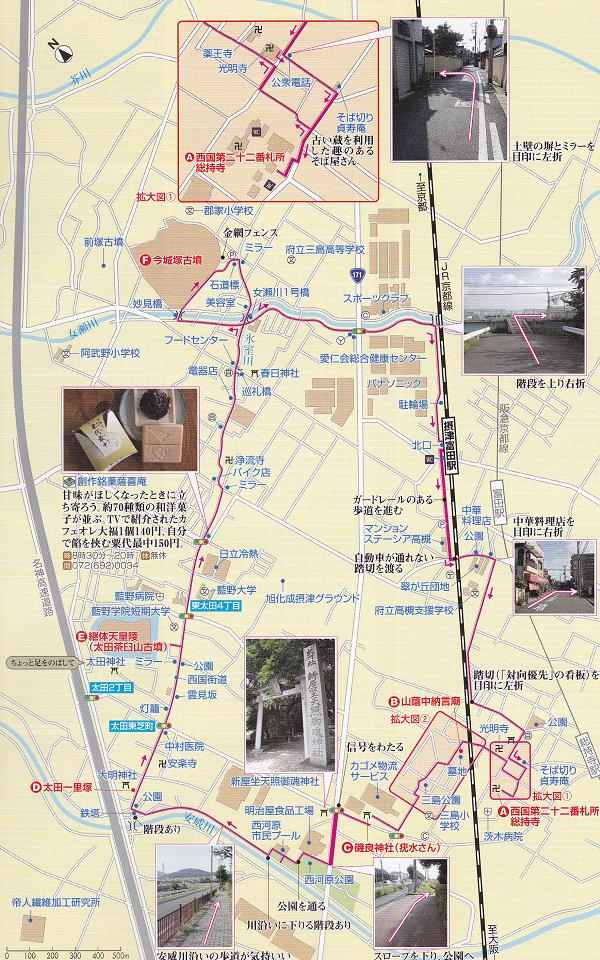 JR摂津富田駅⇒総持寺⇒磯良神社⇒新屋巫天照御魂神社⇒西河原公園 (昼食) |---1.9Km---|--1.0Km--|------------0.6Km-------------|------- ⇒太田神社⇒継体天皇陵(太田茶臼山古墳)⇒今城塚古墳⇒JR摂津富田駅(解散) ---1.7Km---------|----------1.9Km-------------|----1.9Km---| |
