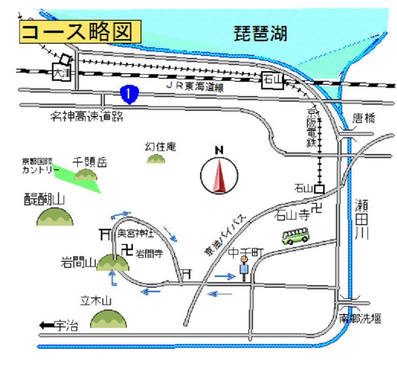 JR石山駅⇒バス;中千町⇒岩間寺⇒奥宮神社⇒中千町・解散⇒バスでJR石山駅へ |----バス----|---3.5km --|--0.4km--|---2.6km---| |