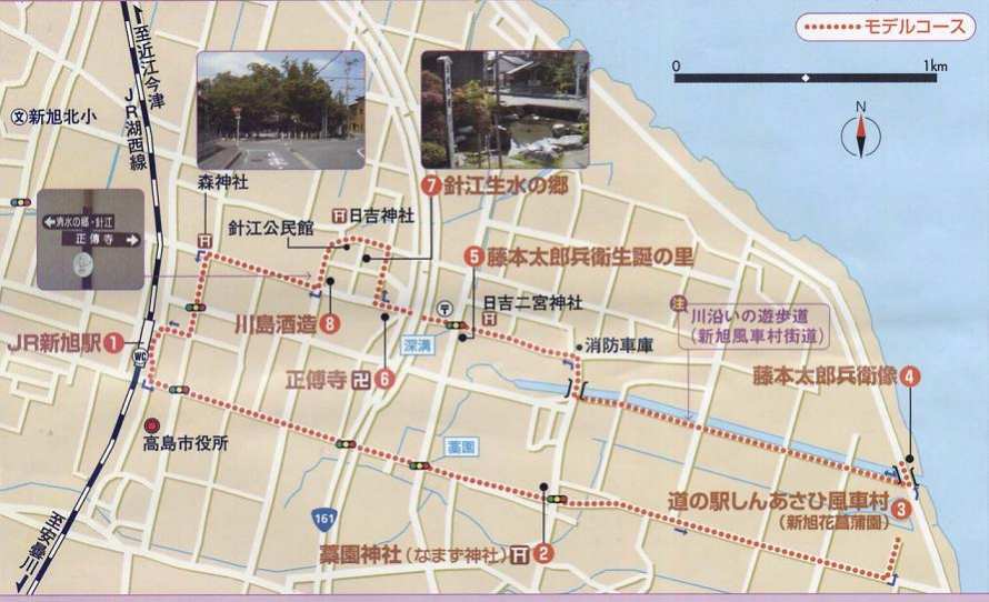 新旭駅前 ⇒ 藁園神社 ⇒ 道の駅しんあさひ風車村(昼食) ⇒ 藤本太郎兵衛の像 ⇒ |----1.9K----|--------1.6K--------|-----------0.3K----------|--- 藤本太郎兵衛生誕の地 ⇒ 正傳寺 ⇒ 針江生水の里 ⇒ 森神社 ⇒ 新旭駅前(解散) --2.0K--------|-----0.3K-----|----0.4K----|----0.6K----|----0.7K----| |