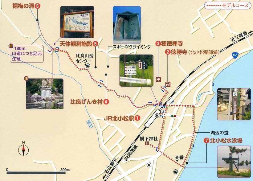 JR北小松駅⇒楊梅の滝⇒種徳禅寺⇒徳勝寺⇒北小松水泳場 (昼食) |----1.6Km----|-------1.6km ------|---1.4km---|----- ⇒樹下神社⇒JR北小松駅(解散) ----0.5Km--|---0.4km --| |