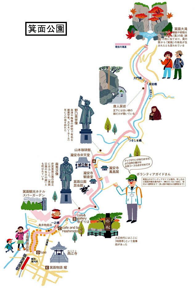 阪急箕面駅 ⇒ 瀧安寺 ⇒ 野口英世像 ⇒ 唐人戻岩 ⇒ 箕面大滝 (昼食) | → 1.5q ← |→ 0.3q ←|→ 0.7q ←|→ 0.4q ←|→→ ⇒学問の道・時習堂⇒阪急箕面駅(解散) → 1.6q ← | →1.5q ← | |
