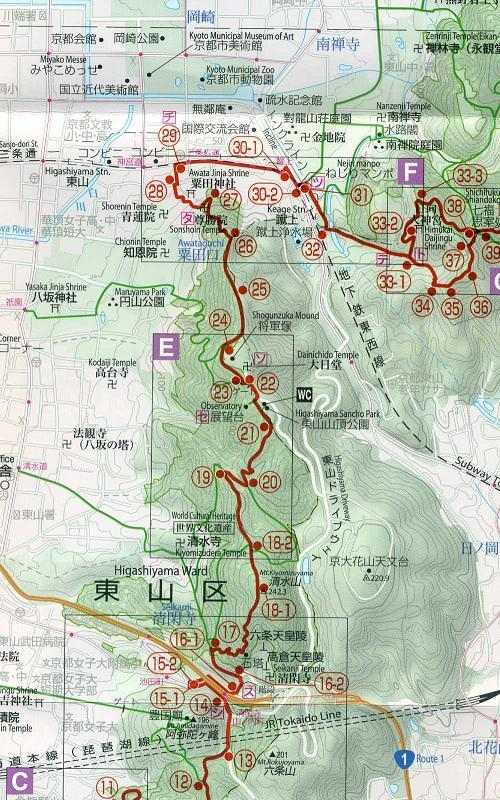 清水五条駅 ⇒ 東山五条 ⇒ 清水山 ⇒ 東山山頂公園(昼食) | → 0.8q ← | → 2.7q ← | → 1.1q ← | → 0.2km ⇒ 将軍塚 ⇒ 尊勝院 ⇒ 粟田神社 ⇒ 知恩院(解散) ← | → 1.6 q ← | → 0.6q ← | |