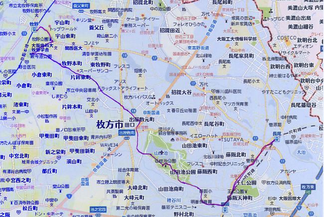 京阪牧野駅−牧野公園−片埜神社−阪今池公園−山田池公園−JR藤阪駅− │------0.4km-------|--0.3km--|---4km---|---1km---|---- −−伝王仁墓−−長尾駅(解散) ---1.5km-|----0.8km--| |