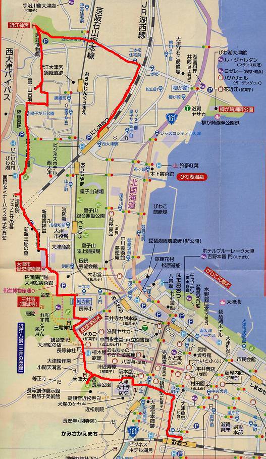 JR 大津駅 ⇒ 京阪 上栄町駅 ⇒ 日 赤〜山手へ ⇒ 長等公園 ⇒ 三井寺(園城寺) 10:00――――――→ 1.0q ←―――――――――――|―――→1.0q ←――| 歴史博物館(休憩・WC) ⇒ 裏山越え ⇒ 新羅三郎の墓 ⇒ 法明院(フエノローザの墓) |―――――――→1.0q ←――――――――|―――――→1.1q←――――→ 皇子が丘公園 (昼食)⇒ 皇子山古墳公園 ⇒ 近江神宮 ⇒ JR湖西線西大津駅 12:00〜12:45 (京阪 皇子山駅) ――|―――→ 0.9q ←――――|――――→ 2.0q ←―――――| [解 散] 14:20 予定 特 記:三井寺、博物館は、拝観、入館料有門前までとします。 ※途中リタイヤー出来ます。・・・ 京阪 近江神宮駅 |