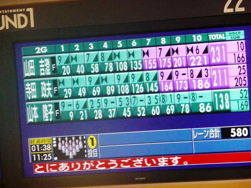 心から感謝を申し上げます。今後ともよろしくお願いいたします。 さて、当月の例会は今田幹事の進行でスタート。冒頭には例月通り、当月に誕生日を 迎えられた方にお祝いのお饅頭をお渡ししてみんなで祝福しました。 当月お誕生日を迎えられた方は、山中さん、加藤さん、遠藤さんの3人です。 また、当月から藤田貴志さん、川坂智栄子のお二人が初めて例会に参加されました。 藤田さん、川坂さん紹介の後、森岡幹事のホッスルでゲームがスタートしました。 2ゲーム目で凄い記録が出そうな予感がしましたが、残念ながらあと少しのところで 途切れてしまいました(下の写真ご参照)。この記録が更に延びる事に今後が楽しみです。 ゲームの最終結果は成績1位には山口さん、2位に遠藤さんが入り、お二人とも 3ゲームで500点を軽く超える好成績を収められました。中でも山口さんは2ゲーム目と 3ゲーム目で同じ214点を取得され、2ゲーム連続のハイゲームという記録を収められました。 4月に競技会が予定されておりますが、その際にも是非今日の成績を収めてくださいね。 来月の例会は3月15日(木)です。みなさんとお会いできます事を楽しみにしております。 |