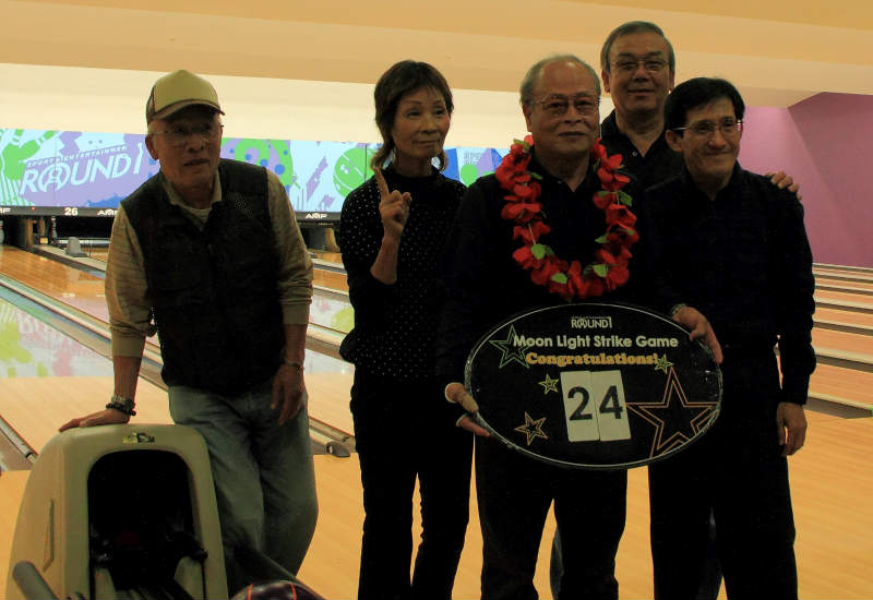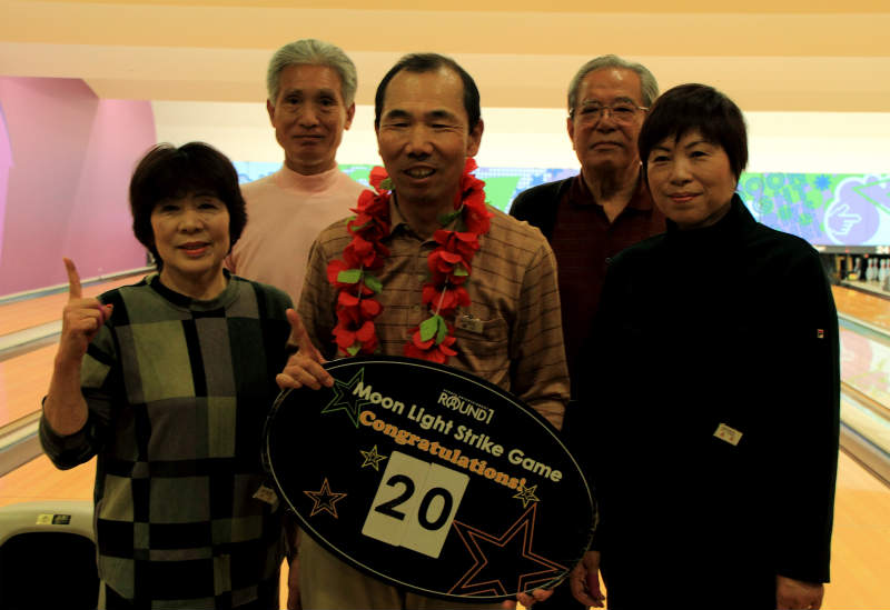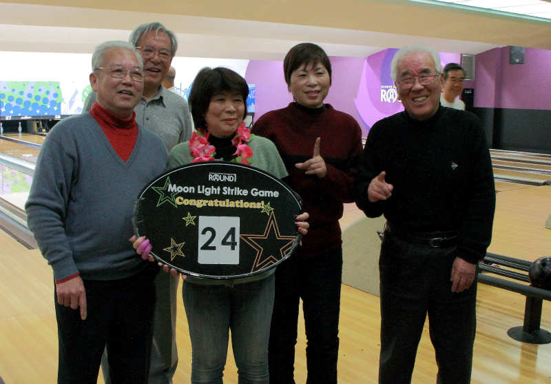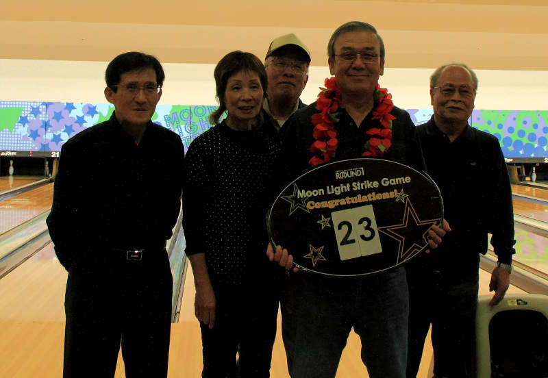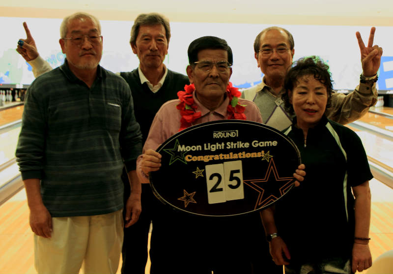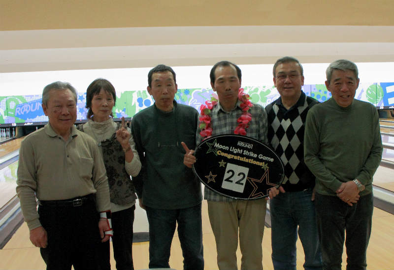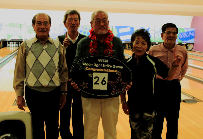 特に遠藤さんは1ゲーム目に209点をあげられ、これが当日のHGとなりました。 また、毎月恒例になりました暗闇の中で投げる「ムーンライト」ゲームでは、これまでにない5人の方が ストライクを取られて、同じレーンでプレイする方とともに記念写真に収まって頂きました。 首にレイを掛けられ記念写真の中央にいる方が、ムーンライトゲーム覇者の5人です。 来月の例会(12月15日 第3木曜日)は「年忘れ競技会」としてレーン対抗戦(団体戦)を予定しております。 競技終了後に場所を移して食事会を兼ねた表彰式も予定しております。 多数のご参加をお待ちしております。 |