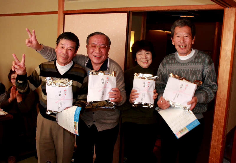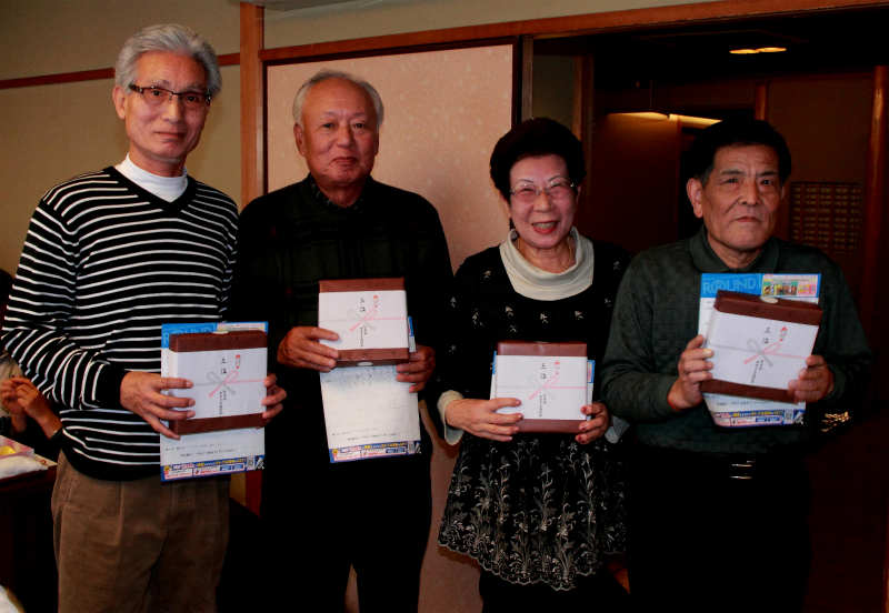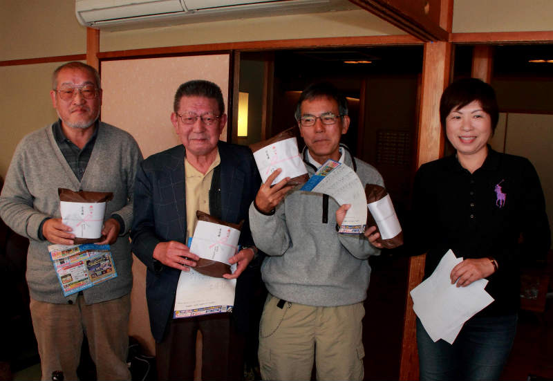「第4回競技会」の表彰式を行い、関口会長から成績毎の景品が各プレイヤーに手渡され