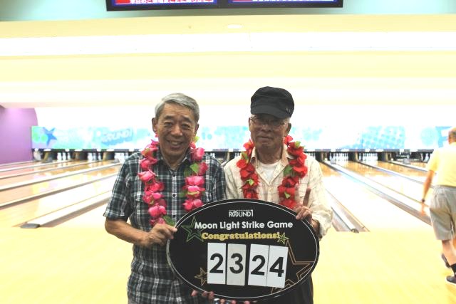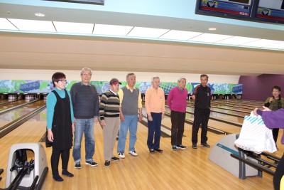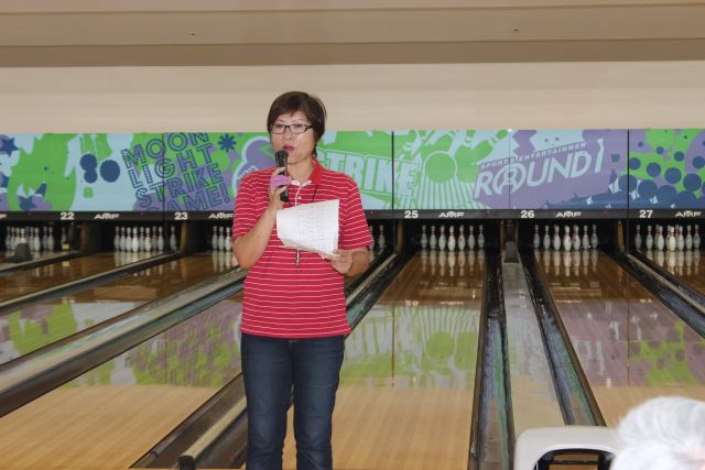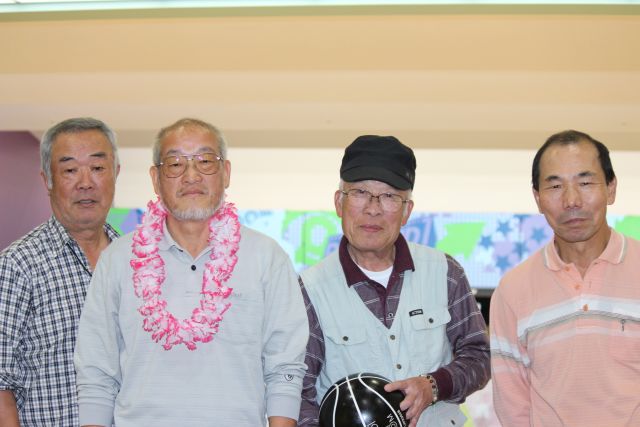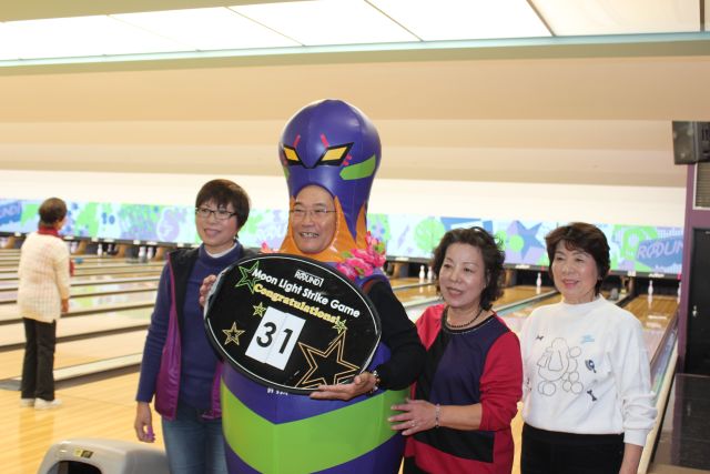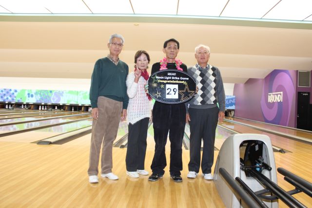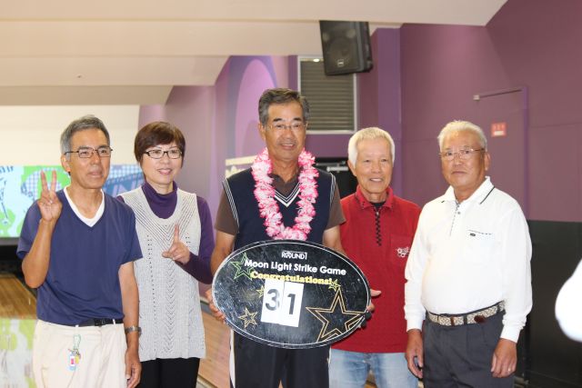 「紅白のお饅頭」をプレゼントの後揃ってカメラに収まって頂きました。 ゲームの方では、当月は1位遠藤さん(向日市)2位山口さん(西京東)3位藤井さん(向日市) 女性では5位で今田さん(山科区)が好成績を収められました。特に遠藤さん(向日市)は4ケ月 連続で1位の優秀な成績を収められています。 「ムーンライト」ゲームでは3人が暗闇の中ストライクを取られた方と同伴のメンバーともに 記念収まって頂きました。下の写真で、レイを掛けられた写真の中央の方がムーンライトゲーム の覇者です。 次回の例会は11月21日(第三木曜日)に予定しております。 ふるって多くのご参加をお待ちしています。 |