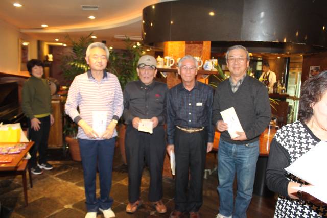 手渡されました。 当月お誕生日を迎えられた方は下の掲載写真から左から大崎文夫さん(伏見中) 佐貫章夫さん(山科区)植松喬一さん(長岡西)の3名です。 今月から参加の新会員山本ツヤ子さん(長岡東)が紹介されました。 ゲームの方では、競技会という事で過去の成績によってハンデイキャップが与えられます。 誰でも優勝のチャンスがあるようになっています。表彰式は会場を「アサヒビヤレストラン」 に移して昼食会の後に実施されました。 成績の方では、1位遠藤幹夫さん(向日市)2位武久辰雄さん(山科区)3位松本茂さん (左京区)が上位に入賞されました。 追伸 支部長より「東海道五十三次・仮想ウオーク」の説明がありました。 皆様も健康推進に毎日楽しみながら歩いて下さい。参加者は地区委員までお申し出ください。 |