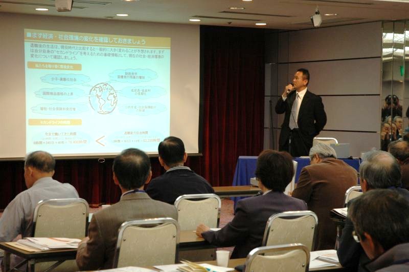 ROKU-GO懇談会(65歳節目懇談会)を実施しました。 京都支部では新会員歓迎会を年2回実施していますが、退職後も引き続き仕事に従事されている方も多く、 若年会員の松愛会活動への参加率の向上が課題となっていました。 その対策として、年金受給が開始され1つの転換期と考えられる65歳の節目に 松愛会活動をより一層理解すると共に関心を高めてもらうために、この懇談会が企画されました。 第一回目の今年は2011年中に65歳を迎えられる方にご案内して、 一般65歳会員8名、65歳地区委員5名、その他地区委員12名の計25名の 参加のもとに懇談会を実施しました。 第1部では住山地区委員の司会で、住友信託銀行・京都支店:財務コンサルタント/米永敏昭氏から 「夢のあるセカンドライフのために」と題して、 シニア世代の今後の生き方について、特に、マネーの管理について示唆の富む、 有意義なご講演を頂きました。ありがとうございました。 引き続き、北村支部長から歓迎の挨拶と松愛会京都支部の概要、行事、活動等に ついての説明があり、また京都支部の7つの同好会活動については各地区委員が分かれて説明して、支部活動や同好会活動に積極的に 参加していただくようお願い致しました。 続いて、全員で記念写真を撮り、第1部は終了いたしました。 第2部は平安の間に移動して、大江副支部長の司会で、 3つのテーブルに分かれて懇親会がスタートしました。 ビールを片手にしばらく歓談しながら飲食の後、65歳会員の自己紹介が始まりました。 現役の時の担当した仕事や思い出、趣味、今凝っていること等を自由に語っていただきました。 皆さま個性的な方が多く、話は尽きませんでした。 引き続き地区委員も簡単に自己紹介して はじめてのROKU-GO懇談会は無事終了いたしました。出席いただいた会員の方々にはこの65歳の節目に松愛活動について ご理解を頂いたと思われます。 平安ホテル近くの京都御所では、秋らしい好天のもとに静かなたたずまいを見せていました。 |