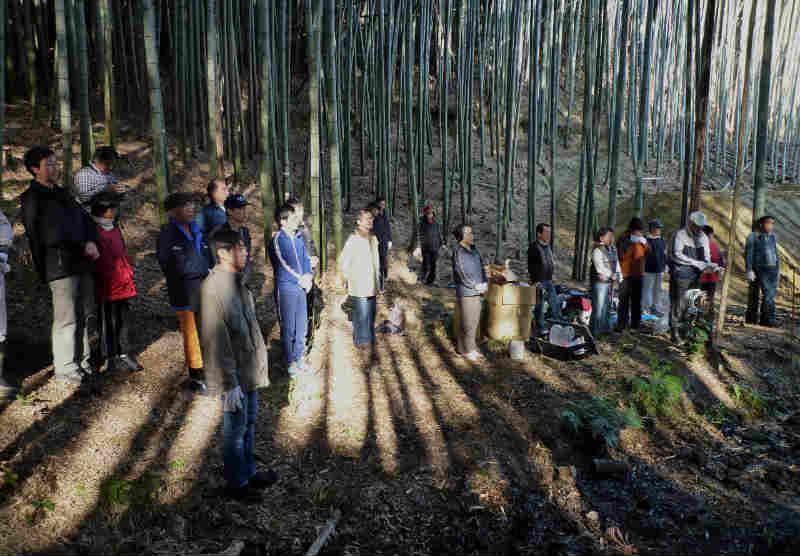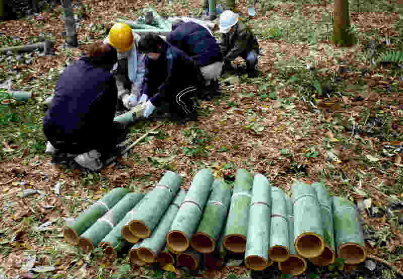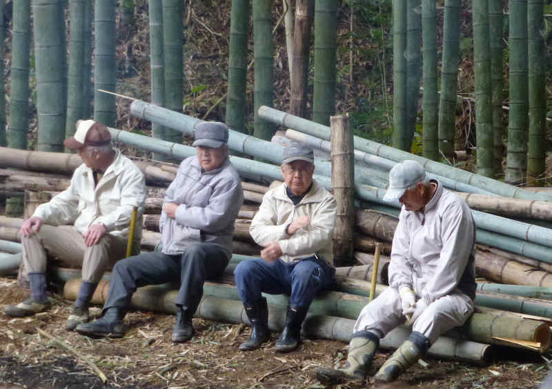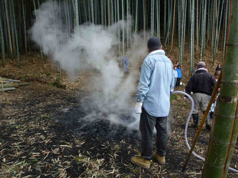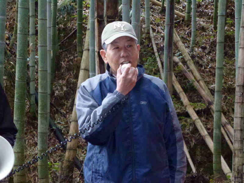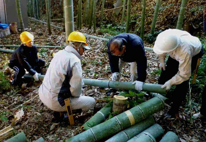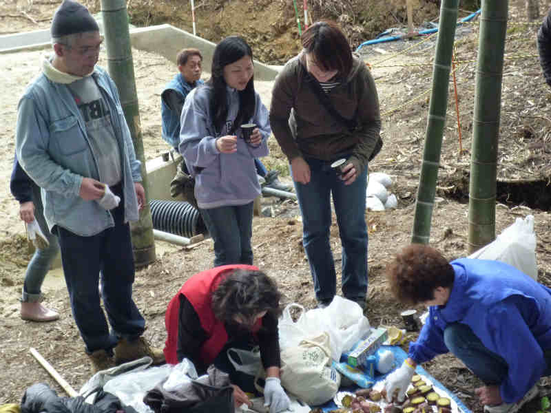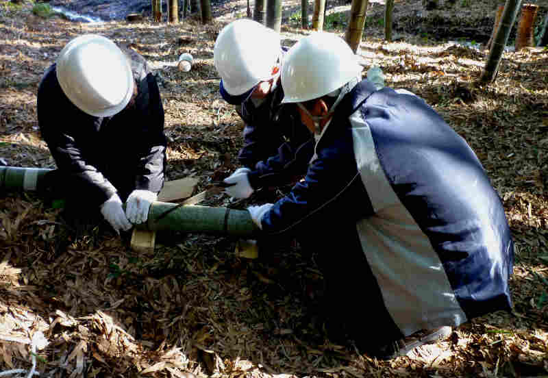 28人もの多くの皆さんにご参加頂きました。 今回は、阪神淡路大震災で亡くなられた方々を追悼し、震災から生まれた、支え合う 「こころ」を次世代に伝え広げるため毎年1月17日に神戸市で実施される「つどい1.17」で 使用される竹燈篭用の竹筒づくりを重点的に行いました。 竹筒切り出し作業の途中には、廃材の焼却を利用して焼いた「焼き芋」をみんなで分け合って 大変美味しく頂きました。 作業終了後には、燈篭用の竹筒を前に並べて全員が集合写真に収まりました。 今回も、参加者皆さんの熱意と努力で200本を超える竹筒が完成し、集合写真撮影の後、 トラック便に積み込みし搬送致しました。 新年1月17日の「つどい」では、私たちが作った竹筒から輝かしい光を放ってくれる事でしょう。 次回の活動は2012年の4月に予定しております。次回の開催はお楽しみの「筍掘り」の 予定ですが、近隣の道路工事の進行状況から実施が難しくなる局面が予想されます。 時期が参りました折にご案内致しますが、実施が決まりました際には奮ってご参加 くださいますようお願い致します。 (永田 一良氏) |
