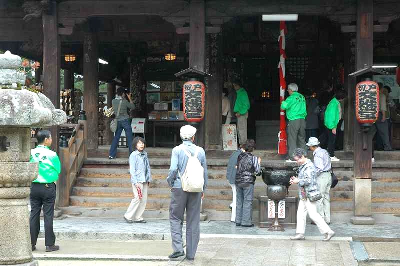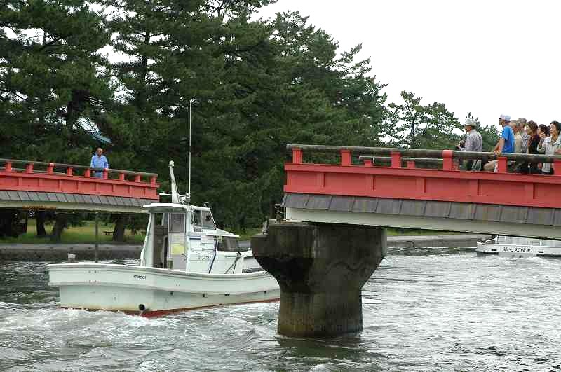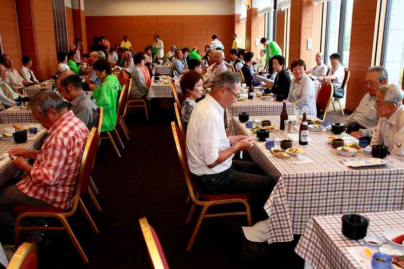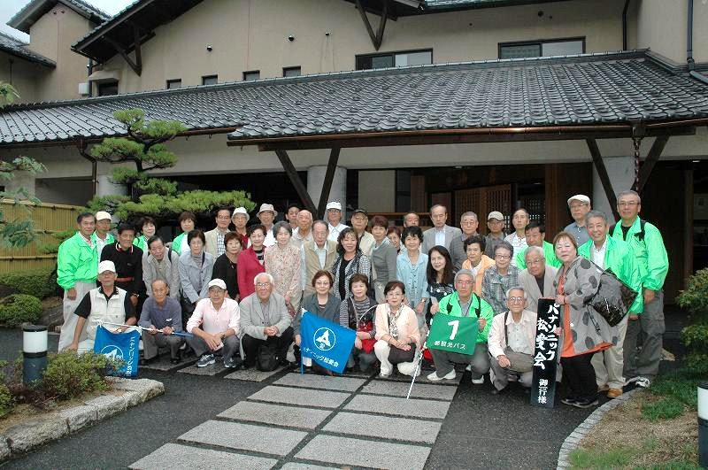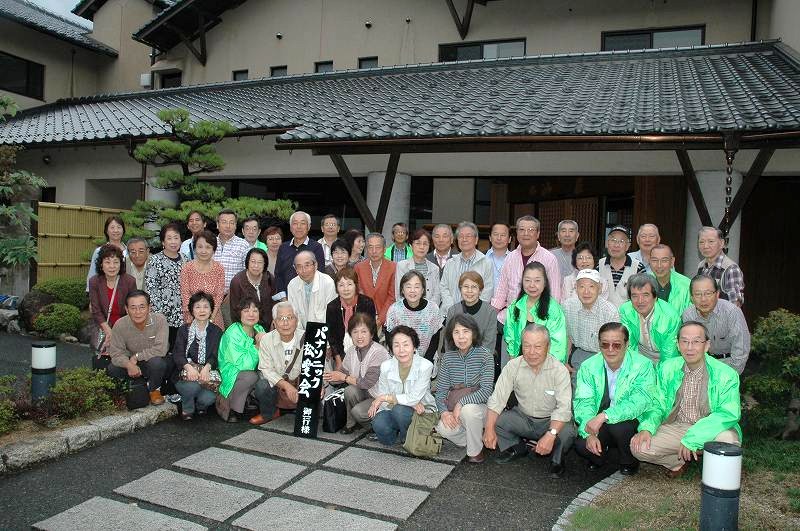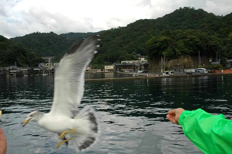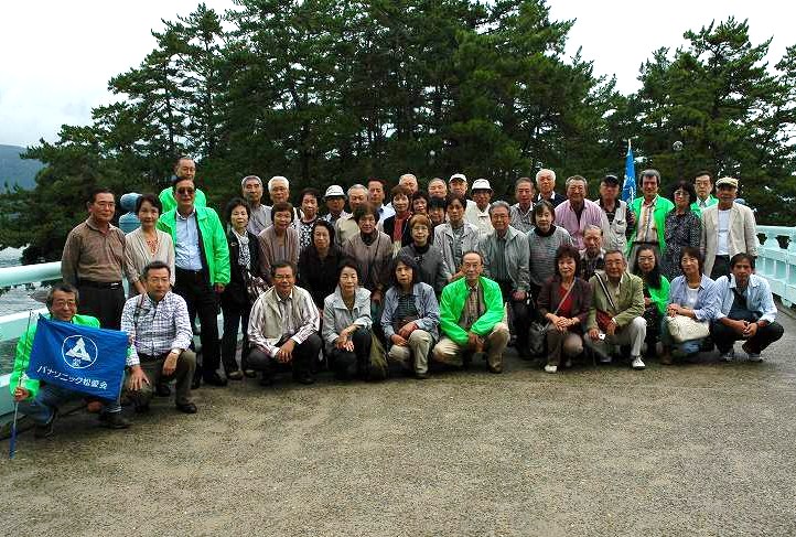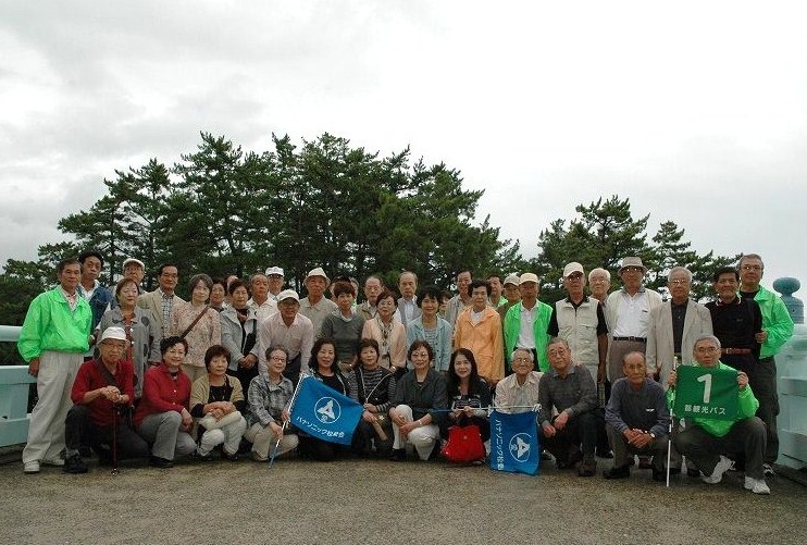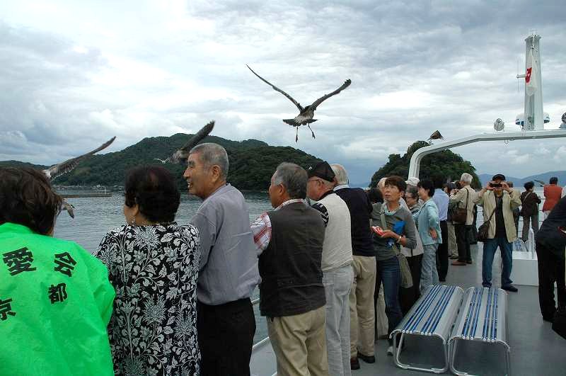 海の幸を味わった後、伊根湾の舟屋を見てきました。 昨夜来の台風が心配されましたが、幸い台風は走り去り、時折雨の降る天気でしたが、予定通り 実施することができました。 バス2台に分乗して、7時55分に京都駅を出発。 まず、天の橋立へ向かいました。途中亀岡付近では霧にむせび、 また雨も少し降ったりして心配されましたが、 天の橋立に着くころには雨も止み、文殊堂を抜けて、天の橋立の松林へ向かいました。 丁度、赤い廻旋橋が回り、数隻の船が橋の側を通るのを見守ることができました。 珍しい風景です。 船が通ると元の橋に戻り、松林へ足を運び、全員揃って記念撮影です。 帰りには文殊堂で手を合わせて、バスへ戻りました。 さて、次はいよいよ、伊根町の油屋での昼食です。まず油屋の玄関で全員で記念撮影をして、2階の 大広間で北村支部長の挨拶、乾杯のあとに、お待ちかねの昼食が始まりました。 舟盛りの刺身はとても新鮮でおいしくいただきました。あちらこちらでは歓談する声が弾みます。 食後には温泉に入ったり、ロビーから日本海をゆっくり眺めたりしてくつろぎました。 再びバスに乗車して古い伊根の町並みを抜け、遊覧船に乗って、伊根名物の舟屋の見学です。 遠くの湾岸には漁船を収める格納庫のある民家が立ち並び、 独特の風情を醸し出しています。 また、船上ではたくさんのかもめが私達を出迎えてくれました。手にとった餌をめがけて、 素早く飛来します。かもめの餌やりに興じる人もたくさんいました。 帰り道では海産物の土産物屋へも立ち寄りました。近海でとれた 塩干物がたくさんあり、試食しながら、皆たくさんのお土産を買い込んでいました。 京都への帰路につく時間になりました。帰りの車中ではビンゴゲームに歓声を上げているうちに、 ほぼ予定通り、6時30分に京都駅へ無事到着。 今日は心配された台風が去り、雨もほとんど降らずに油屋での海の幸を味わい、 舟屋の景色を楽しみ、初秋の秋を堪能することができました。 皆さん、今日の思い出を糧にまた明日から有意義な日々を送って行かれるでしょう。 |