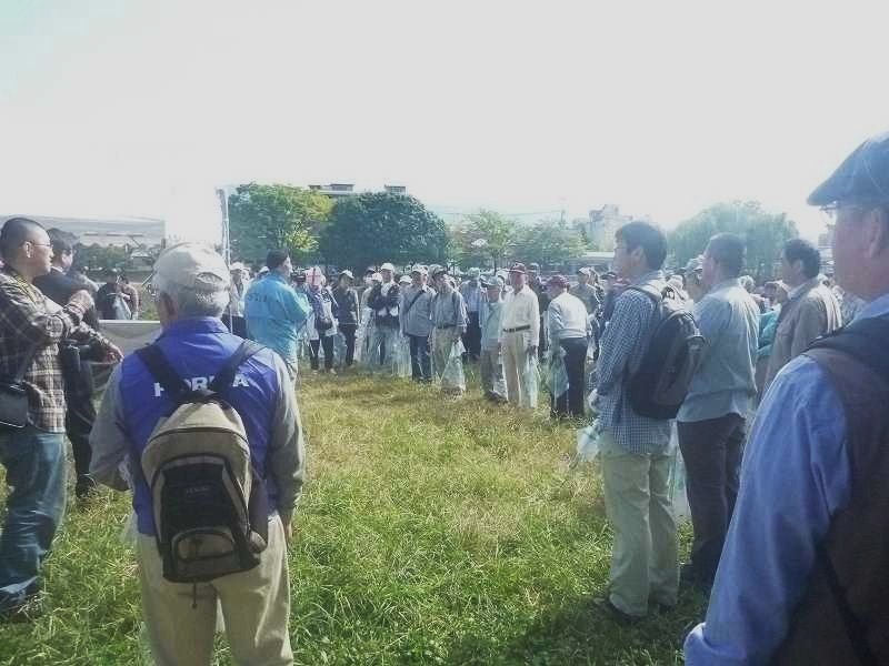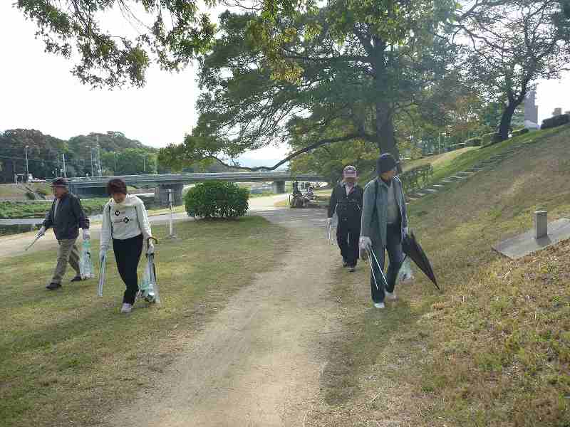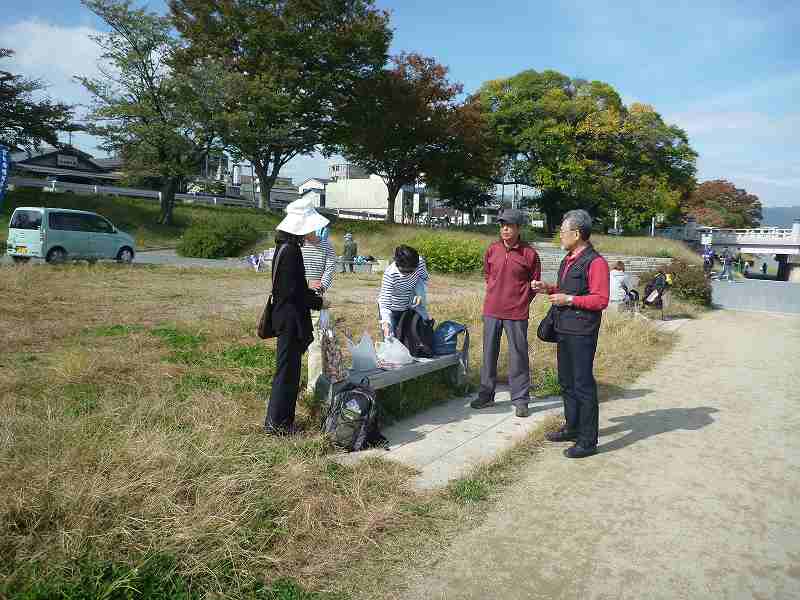 今日は丸太町橋から三条大橋までを担当です。 当日は10時に丸太町橋の北西岸に集合。 京都支部松愛会会員は11名が参加しました。今日は他のグループもはたくさん参加して、 丸太町橋からは全員で約300名が鴨川河川敷の清掃活動に参加したようです。 「鴨川を美しくする会」の世話役の方とミーティング、そして今日は副知事さんにも激励して頂きました。 ごみ袋、手袋、金はさみを皆それぞれ手にして、いざ出発! 今回我々松愛会会員は東岸を中心に清掃活動を行いました。 最近の鴨川の河川敷は一見してごみはほとんど見当たりません。 でもよく見ると茂みの中やベンチの周りには 少しごみがあります。丹念にごみを見つけては袋に詰めて行きます。 絶好の秋晴れの中、ハイキングを兼ねての清掃活動です。 若い人もたくさん参加されて、いつもとは違って、若々しい雰囲気です。 鴨川の沿道では注意してみるといろいろと目につくものがあります。 沿岸の料理屋から床がたくさん見えます。夏の夜には涼風の中、たくさんの人が床料理を楽しみました。 京都ならではの景色です。 見過ごしそうな草花も鴨川のせせらぎをバックにすると一幅の絵になります。 河川敷で幼い子供の後を追って写真を撮る母子の姿は幸せいっぱいです。微笑ましい光景です。 ゴールの三条大橋が見えてきました。三条大橋のたもとには弥次喜多の銅像も立っています。 鴨川沿いをゆっくりと歩くことにより、 普段は気にも留めない小さな発見を楽しむことができました。 また、京都の隠れた名所も垣間見ることができました。 気が付いてみると皆たくさんのごみを集めていました。 ごみを世話役に渡して、冷たいお茶を飲むと、 今日一日の疲れも癒されました。松愛会京都支部の参加者で集合写真を撮り、 清掃活動を無事終えることができました。 心なしか鴨川がきれいになったように感じます。 今日は少し世の中のためになることをして、気持ちよい汗を拭いながら、 皆さん気分良く帰途に着くことができました。 |