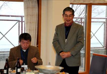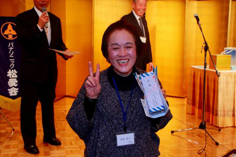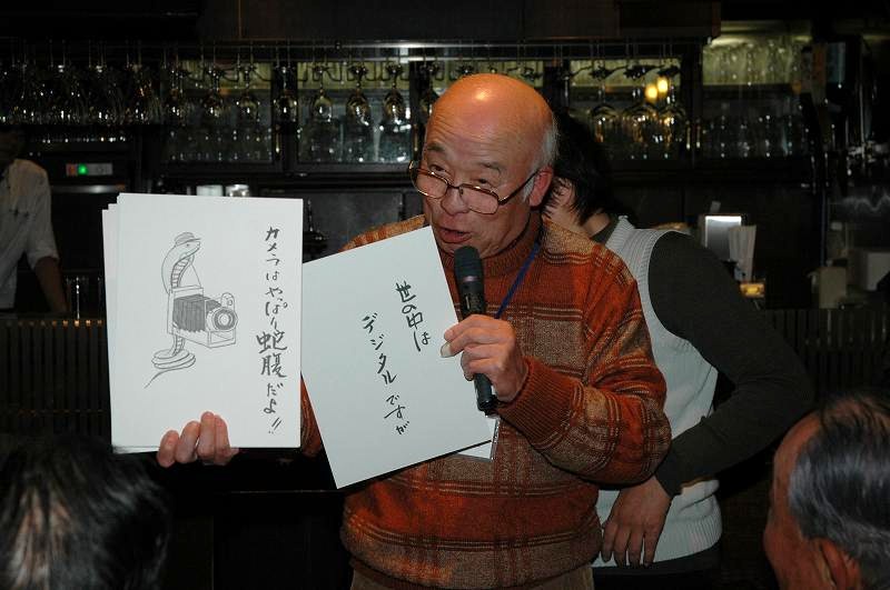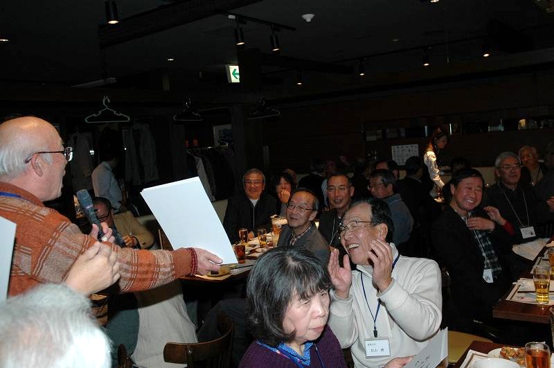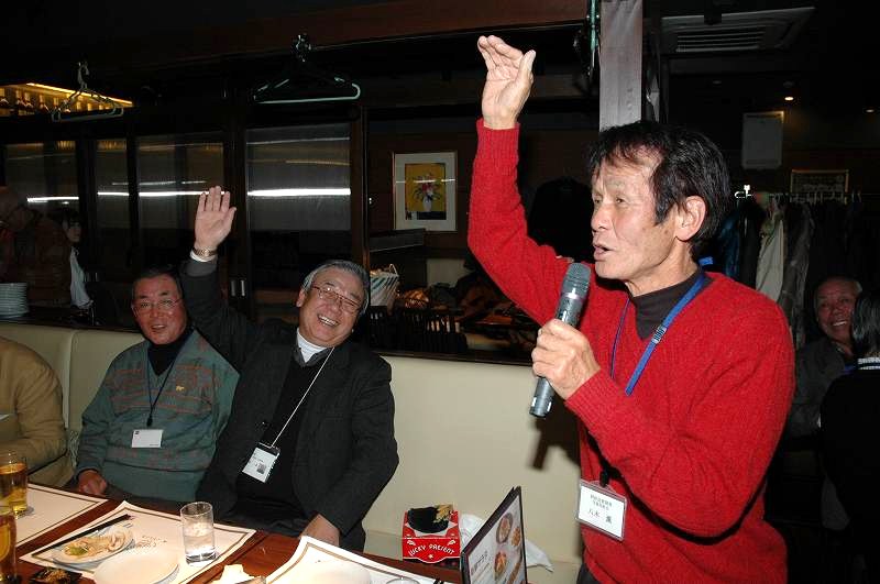 43名の方が出席して大いに盛り上がりました。 懇親会は大江副支部長の司会でスタートしました。まず北村支部長が挨拶され、 次に今回数名の方が初めて出席され、紹介されました。その後、前支部長の大崎様のご発声で乾杯、スタートしました。 各同好会の役員や地区委員の間で交流を深める年に一度のチャンスです。 お酒が入るとすぐに、あちらこちらからは楽しい歓声があがります。 今年も舟盛りの刺身が振る舞われ、大いに盛り上がりました。 間もなく、絵手紙同好会を主催されている大崎様から、来年の干支の蛇をからませて、 各同好会からのメッセージを絵手紙に託してご紹介下さり、 大いに受けました。力作です。 続いて、各同好会からも簡単に一言お話を頂きました。 宴はたけなわです。 さて、次は抽選会です。10名の方に商品券が当たりました。 当たった方は皆嬉しそうです。 最後は波多野様より本懇親会のいきさつを語りつつ、締めて頂きました。 今年も早いもので、気が付けばあとわずかです。今年は我がパナソニック社を含めて、 電機業界は厳しい年でしたが、来年は今年よりきっと良い年になることを 祈って、宴を終えました。 大崎文夫様の作画作品は、ここから見ることができます。 |
