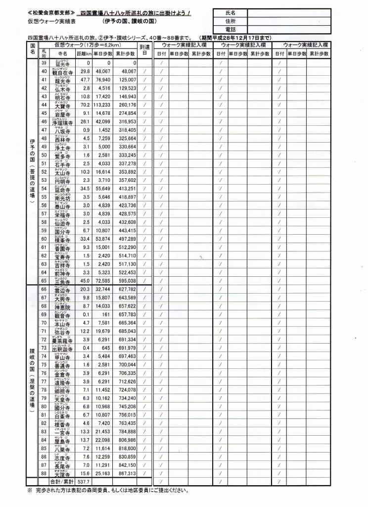 本年は 残り札所40番〜88番までの約538Km・歩数にして