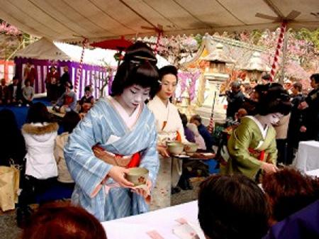 | 2月25日(木) 梅 花 祭 北野天満宮 TEL 075-461-0005 ○2月25日は、祭神菅原道真公の命日にあたり、梅花をこよなく愛でた道真を偲び祭典が 行なわれます。茶会も行なわれ、秀吉の北野大茶湯にちなみ梅苑で野点の席が設けられま す。催事いっぱいに彩りを添える上七軒の芸妓・舞妓さんたちの接待に心が和み、京の都に 春を告げる優雅な催しに、訪れた人々は京の奥深さに浸るひと時を過ごします。 宝物殿も特別に公開、またこの日は毎月の縁日・「天神市」の日でもあります。 ○野点茶席 午前10時 〜 午後3時 ○茶拝服券 1,500円(宝物拝観とお供物引き換え付) |