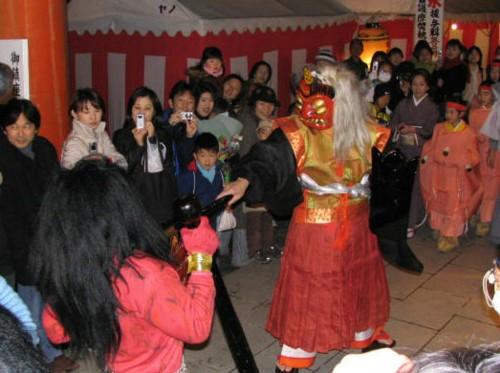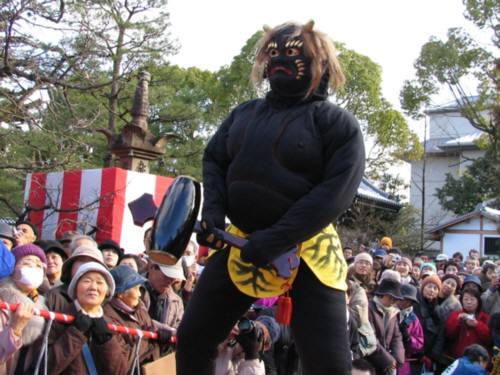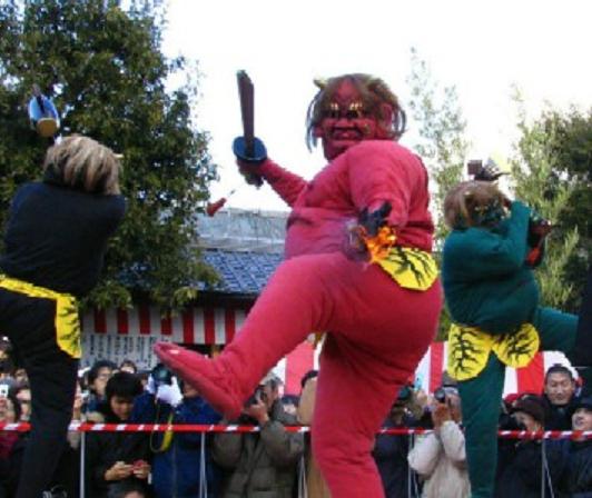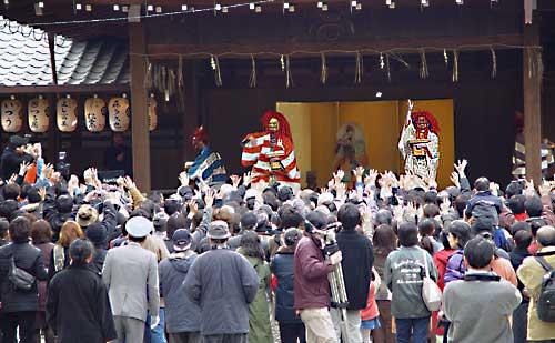 | 《 よみがえる平安時代の追儺式 》 平安神宮 12時から茂山社中による奉納狂言。14時からの「大儺之儀(だいなのぎ)」は、平安時代の 追儺式を再現したもので、一度追い払った鬼が再び拝殿に上がり「鬼の舞」を披露する。 続いて、地元名士、福男、福女による豆まきがある。 ●期 間:2月3日(水) ●問合せ:平安神宮 TEL 075-761-0221 |