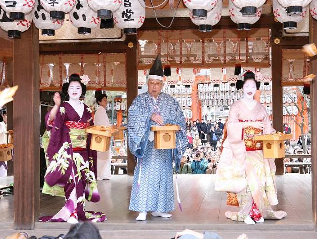 | 《 狂言に感動、日本舞踊にうっとり 》 北野天満宮 13時頃から神楽殿にて「北野の追儺式」を行なう、摂社・福部社の祭神である鬼を払う 福の神の追儺狂言を茂山千五郎社中が奉納し、続いて上七軒の舞妓による奉納舞踊、 最後に豆まきがあります。 ●期 間:2月3日(水) ●問合せ:北野天満宮 TEL 075-461-0005 |