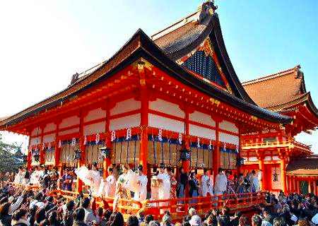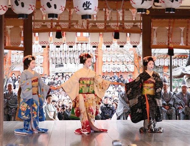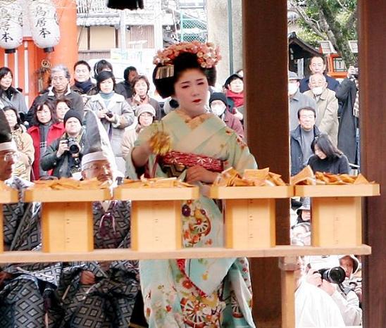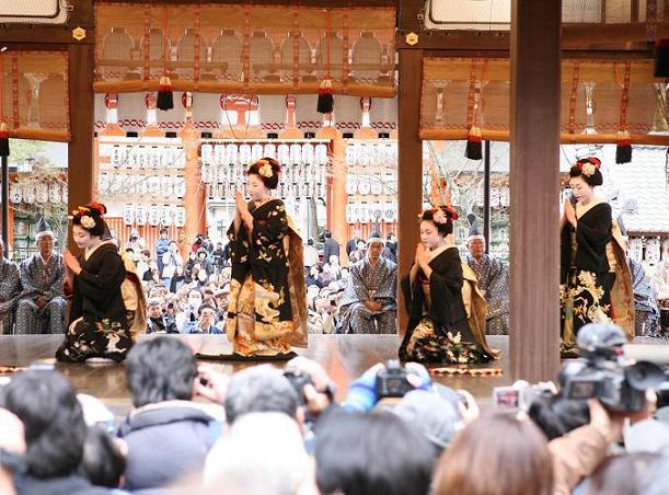 | 《 幸せを携えてやってくる鬼一族の【福鬼物語】 》 八坂神社 古くから中国で不老不死の地と信じられてきた蓬莱の島から、新年の幸せを祈って訪れる 福鬼たち。親鬼を先頭に娘鬼、婿鬼、眷属鬼、召使鬼が舞殿に上ると、厳かに神事の始まり を告げる。鬼たちが蓬莱の珍品を献上した後、鬼と神(人間には見えない設定)との盛大な 酒宴が催される形で進行し、鬼たちは神へ酒を勧めるたびに、除災、招福、天下泰平を願う 優美な舞を披露する。舞が終わると、地霊を封じ込める反閇(悪を踏み破り吉を呼び込む 歩行術)を行なう。その後は福もちをまき、神事を終えた鬼たちは観客の頭をなでて、 福を授けながら帰っていく。 ●期 間:2月2日(火)・3日(水) 午後1時、午後3時 ●舞踏奉納と豆まき 2月2日 午後1時、先斗町 午後3時、宮川町 2月3日 午後1時、祇園甲部 午後3時、祇園東 ●今様奉納(予定) 2月3日 午前11時 ●問合せ:八坂神社 TEL 075-561-6155 |