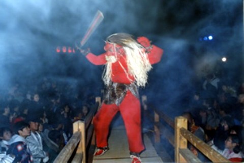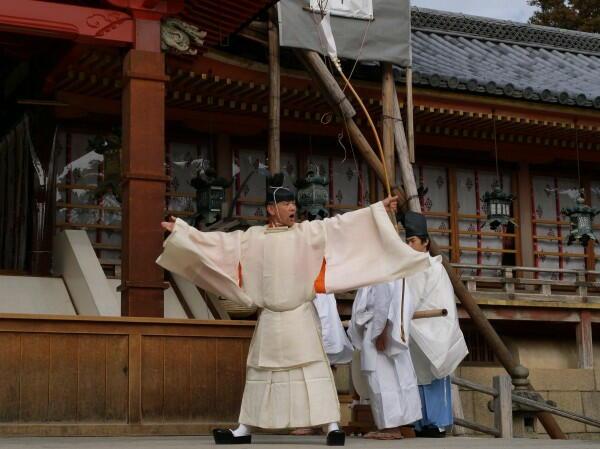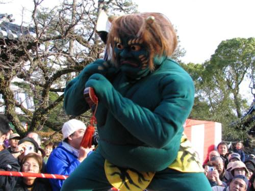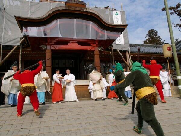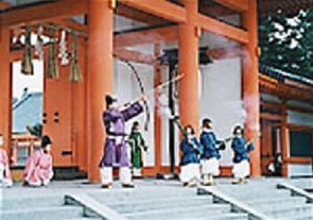 | 1月31日(日) 鬼やらい神事 石清水八幡宮 TEL 075-981-3001 ○洛南の古社に伝わる古式の行事は節分の前の日曜日に行われます。本殿前で本兆弓で 四方が射られ、本兆剣にて四方が打たれ、その後境内に現れた鬼に豆が撒かれます。 参詣者には「福豆袋」が授与されます。 |