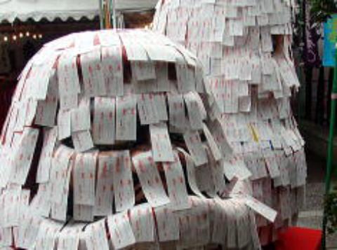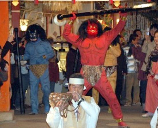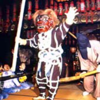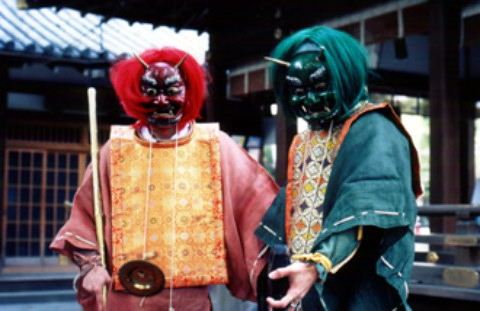 | 《 丸々と太った三匹の邪鬼 》 廬山寺(ろざんじ) 同寺恒例の「追儺式鬼法楽(鬼おどり)」は、天暦4(950)年に、300日の修法を行なって いた元三大師良源が妨害する三匹の鬼を退散させるという故事にちなんで行う行事。 赤鬼、青鬼、黒鬼が表れて踊りまわるなか、追儺師が邪気を払う法弓と蓬莱豆・福もちで、 鬼たちを門の外へと追いやる。武器を取り上げられ、くるくると回りながら去って行く鬼たちの コミカルな動きは、チョトしたコントを見るようで実に楽しいもの。 他では見られないブクブクと太った独特のスタイルにも注目。 「赤鬼」 たいまつと宝剣を持ち、人間の醜い欲である“貪欲”を象徴。 「青鬼」 大斧を持ち、怒り、憎しみ、恨みといった憎悪の感情“瞋恚(しんに)”の権化。 「黒鬼」 物事を正しく判断できないことを表す“愚痴(ぐち)”を実体化した鬼で、木槌を持つ。 ●期 間:2月3日(水) 「追儺式鬼法楽(鬼おどり)」は、午後3時から ●問合せ:廬山寺(ろざんじ) TEL 075-231-0355 |