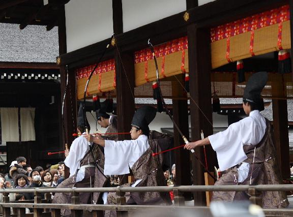 | 《 狙うは12枚の鬼の的 》 下鴨神社 10時から本殿祭、12時頃から鏑矢(かぶらや)を楼門の屋根越しに飛ばす追儺弓行事。 引き続いて、「鬼」と書かれた12枚の的を射て災厄を払う十二的奉射、福豆、福もちまきを 行う。また終日、甘酒の接待(無料)があります。 ●期 間:2月3日(水) ●問合せ:下鴨神社 TEL 075-681-0010 |
