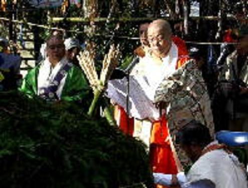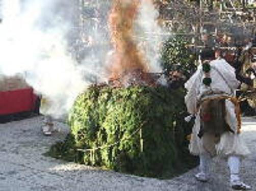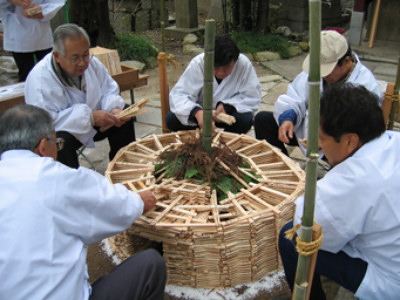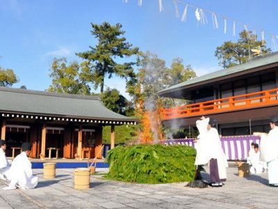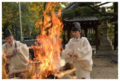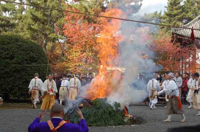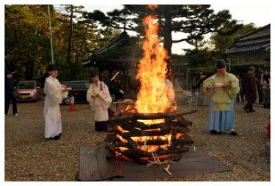 | 11月15日(日) 御香宮神社火焚き祭 御香宮神社 TEL 075-611-0559 拝殿前に新穀のワラ束を一対たて、忌火で点火し、奉納された数千本の御火焚串を焚き上げます。 |