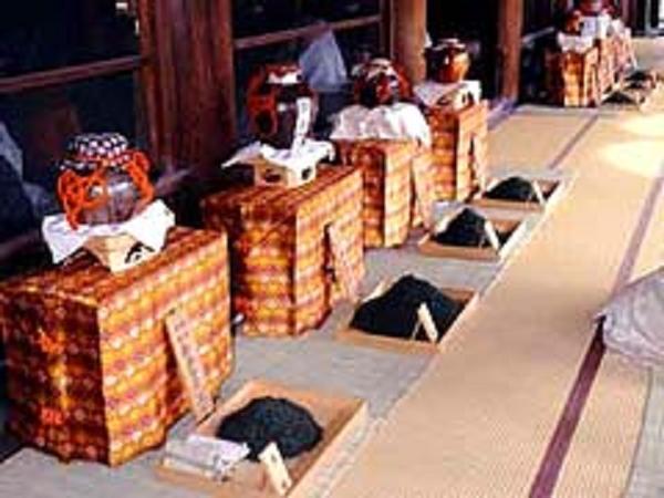 | 11月26日(木) 御茶壷奉献祭 北野天満宮 TEL 075-461-0005 天正15年10月1日豊臣秀吉公が北野天満官御神前にて自ら点茶し奉献、千利休らをして北野 松原にて催した「北野大茶湯」の縁により毎年12月1日に献茶祭を斎行する。 そのお祭りに使われるお茶が毎年木幡(こはた)・宇治・菟道(とどう)・伏見桃山・小倉・八幡・ 京都・山城等の各茶師より茶壷に入れられ奉献される。当日、午前11時一の烏居内西側の松 向軒前を発した御茶壷行列が本殿到着後、御茶壷奉献祭を斎行し、続いて古式ゆかしく茶壷の 口切式が神前にて行われる。 奉献に使用される御茶壷は各々由緒ある物ばかりで、唐櫃に入れられて御神前まで運ばれる。 この日の御茶壷奉献祭・口切式に始まり12月1日の献茶祭と続く一連の行事が「北野大茶湯」 の縁による独特のもので400年余りの歴史をもつ。 |