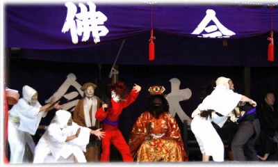 | 11月6日(金)〜8日(日) 神泉苑大念仏狂言 神泉苑 TEL 075-821-1466 神泉苑狂言は明治36年に三条台若中からの奉仕出演と、神泉苑及び地域の人々の出演 及び協力により「神泉苑大念佛狂言講社」が結成された。以来、ほぼ百十年にわたって 狂言を執行しており、昭和58年6月1日には京都市の無形民俗文化財に登録された。以来 この民俗芸能を保存、継承するため神泉苑狂言として公開されている。 |