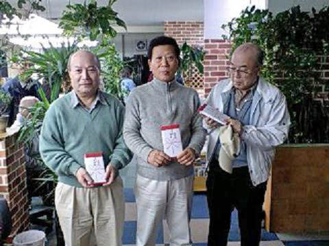 【 懇親大会入賞者は次の通りです。 】 優 勝 安原 昭治 氏 (伏見区) 準 優 勝 古川 政男 氏 (向日市) 第 3 位 大久保三木夫氏 (西京区) 第 4 位 杉村 光照 氏 (西京区) 第 5 位 茂中 達孝 氏 (長岡京) 第 6 位 森 秀雄 氏 (長岡京) 第 7 位 杉村 栄一 氏 (西京区) 第10位 能勢美津代 氏 (??区) 第15位 畠山 幸雄 氏 (??区) 第20位 山中 茂 氏 (上京区) 第25位 久保 寿男 氏 (伏見区) BB賞 佐々井 仁 氏 (伏見区) 以上 |
