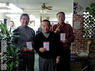 【平成20年度 1月度懇親大会の成績は次の通りです】 優 勝 大久保 弘幸 氏 (右京区) 準 優 勝 小林 普 氏 (長岡京市) 第 3 位 藤木 加巳 氏 (南 区) 第 4 位 前川 訓広 氏 (南 区) 第 5 位 菱沼 正弘 氏 (長岡京市) 第 6 位 樋口 弘 氏 (長岡京市) 第 7 位 杉村 光照 氏 (西京区) 第10位 能勢美津代 氏 (??区) 第15位 久保 寿男 氏 (伏見区) 第20位 河原林 育穂 氏 (南 区) 第25位 畠山 幸雄 氏 (??区) 第BB位 藤田 貴士 氏 (下京区) 以上 |