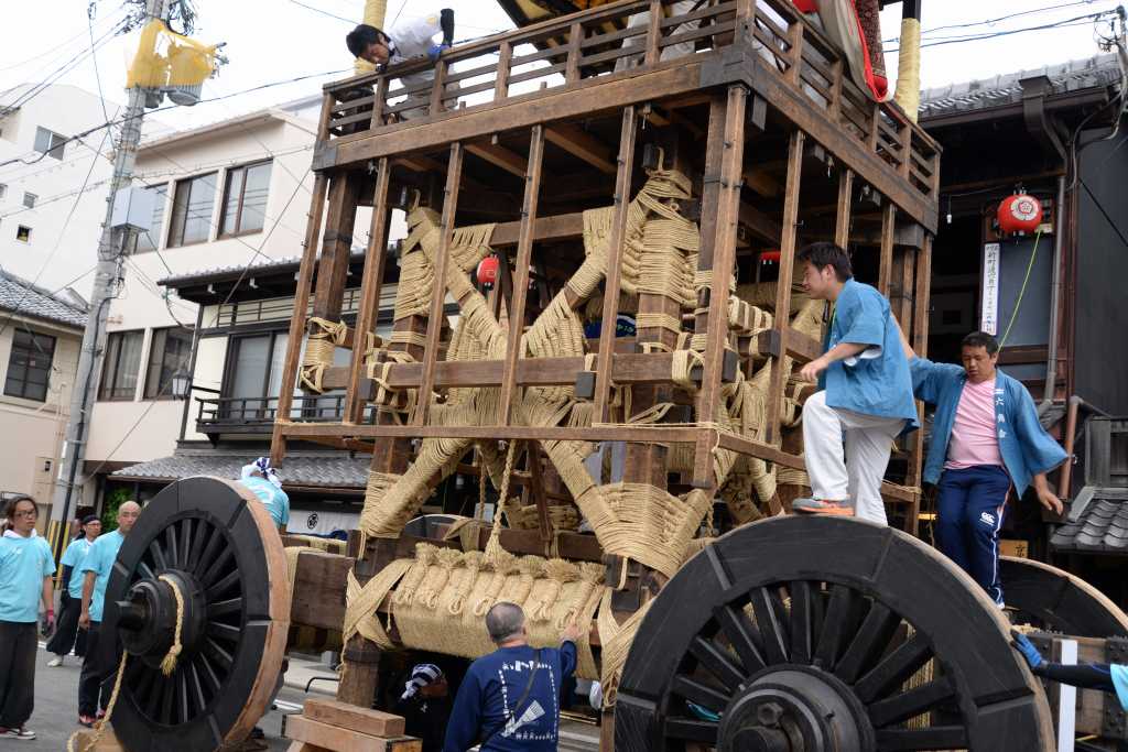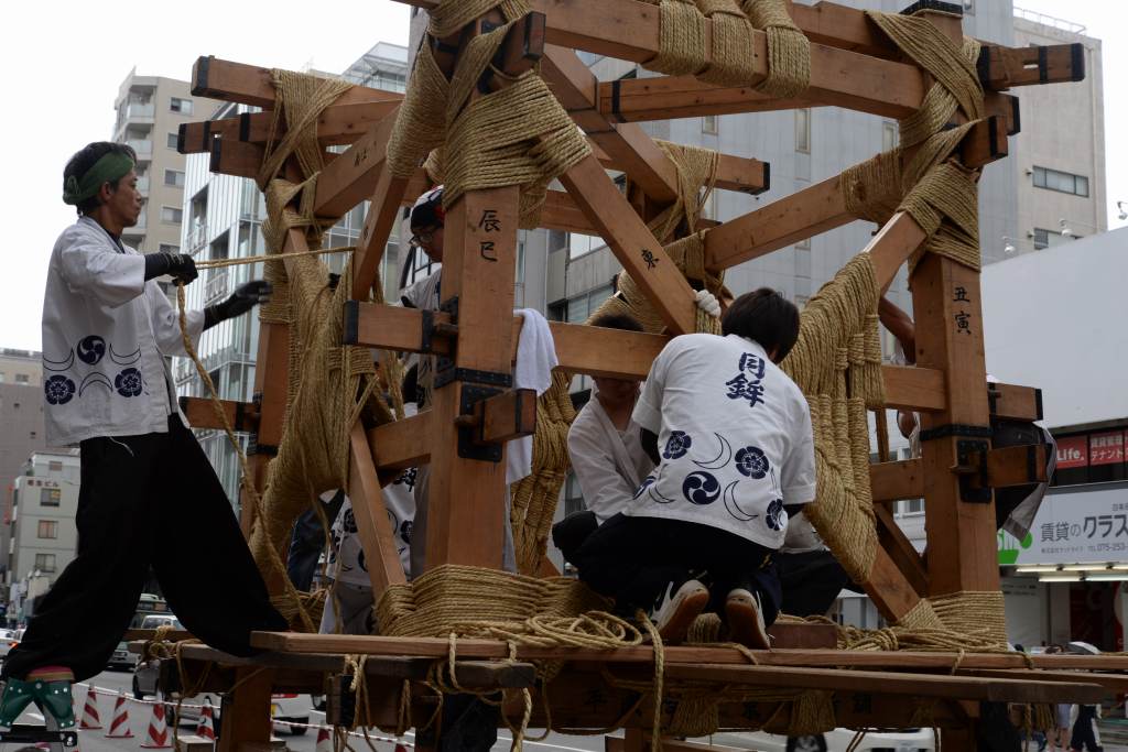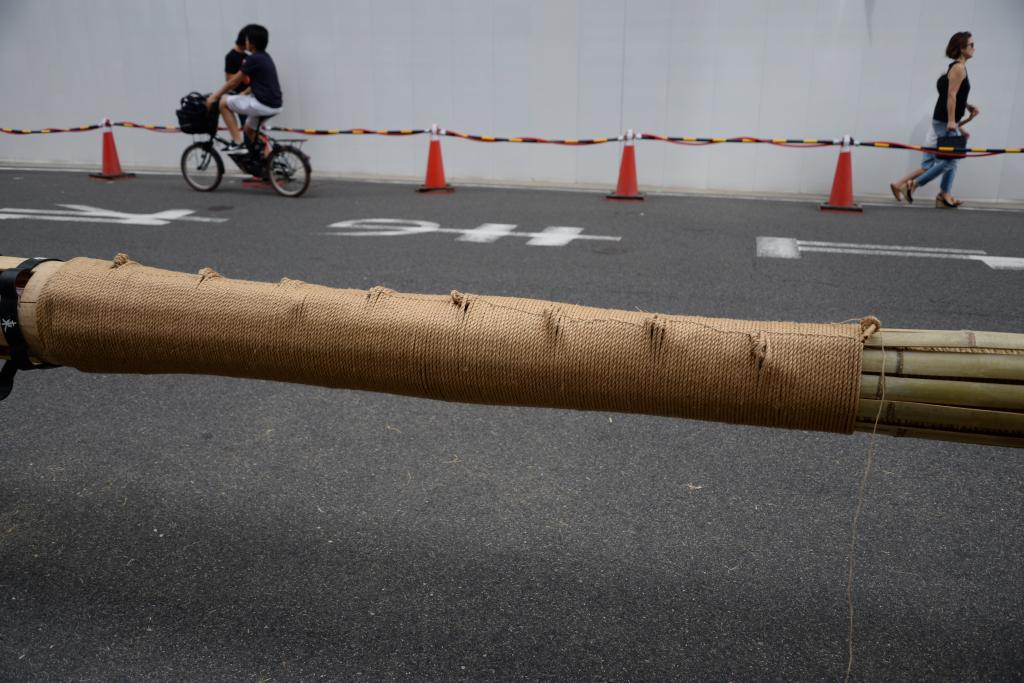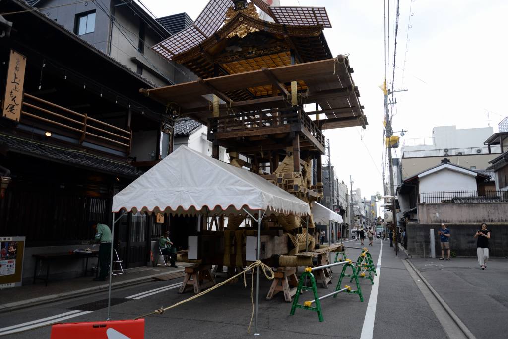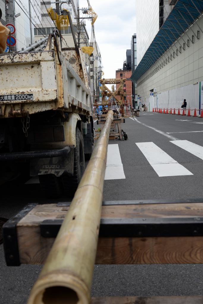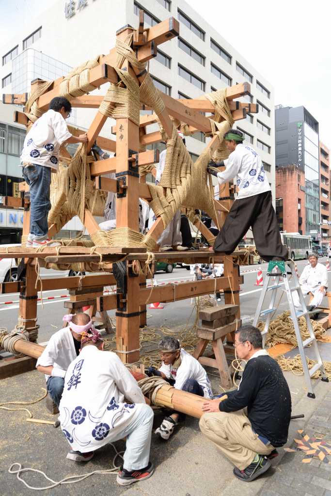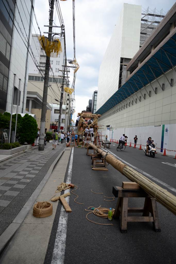 7月10日は多くの鉾町では鉾建てが始まります。今年は10日は日曜日でめぐりあわせが良かったものですから 気が付けば、鉾立てを見に行きました。 昼になり、体を持て余したときに鉾町まで走ってしまいました。鶏鉾あたりまで来ました。 四条烏丸の近くです。まさにしめ縄で、鉾を組み立てているところでした。 くぎは1本も使わずにしめ縄を巻きつけて鉾を組み立てます。またそばには鉾の中心部にそびえる心棒も組み立て中です。 単純な構造ではなく、木材と竹で組み合わせた複雑な構造です。以前この芯柱を立てるところに遭遇したことがあります。 地中にウィンチを引っ掛ける取ってがあり、それらを使って柱をたてているのには感動したものです。 重機は使わず、すべて人力で柱を立てていました。皆、器用にほこに荒縄を巻きつけて行きます。一日かけて、組み立てて行きます。 鶏、月鉾、長刀鉾のあたりを見てきました。 地方からきたとお思われる人たちが盛んにカメラのシャッターを切っていました。皆大きなカメラを持っています。 熱気を感じます。どこかの団体の専門家が解説をしたりもしていました。伝統わざを支える熱気を感じました。