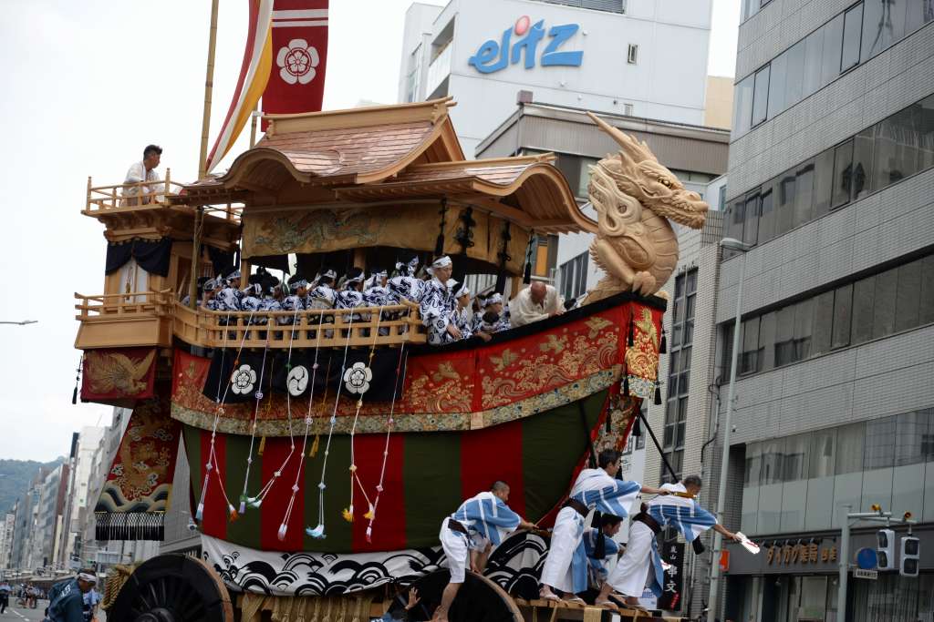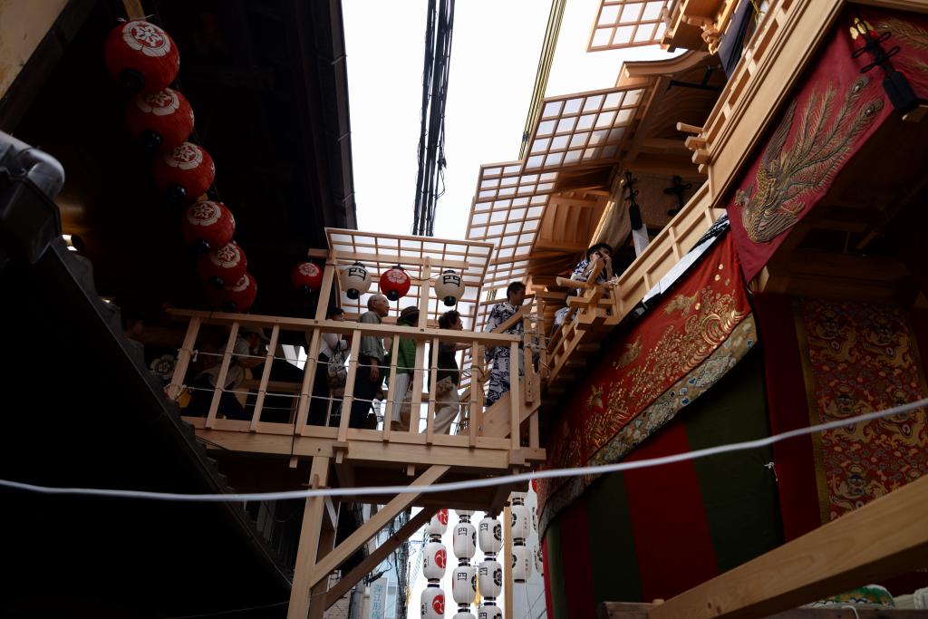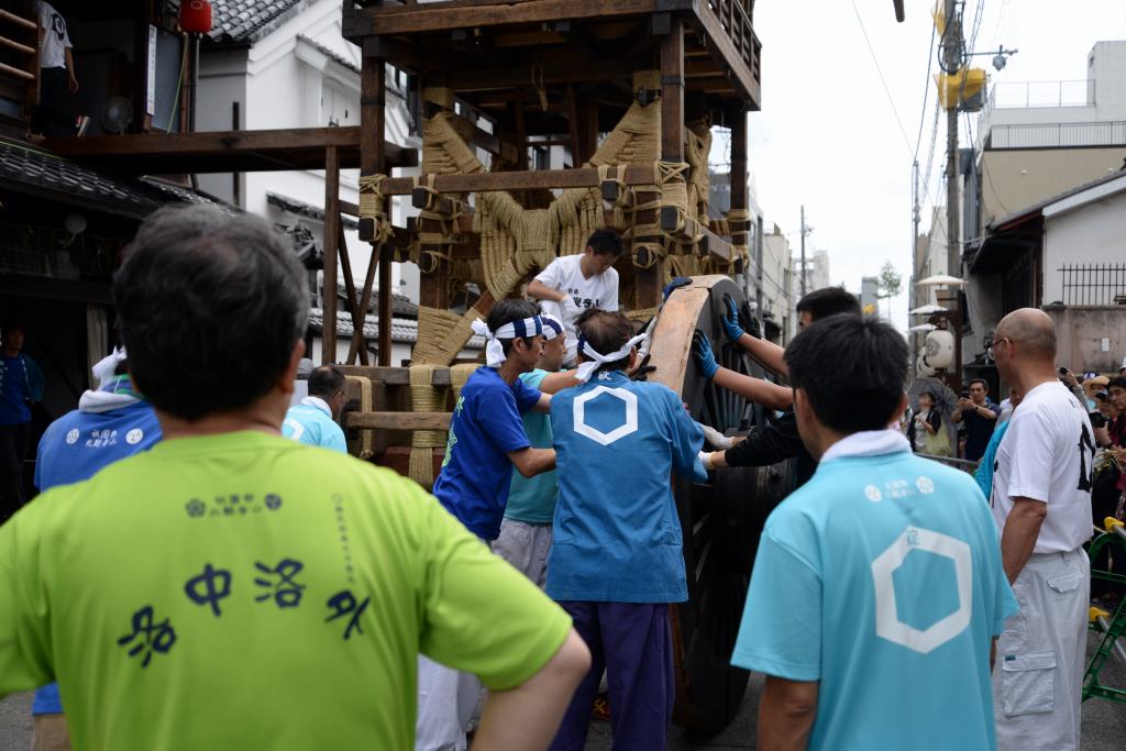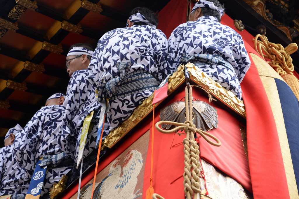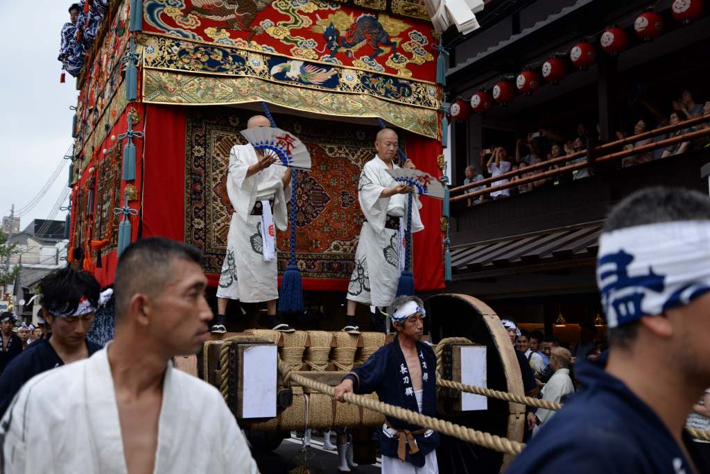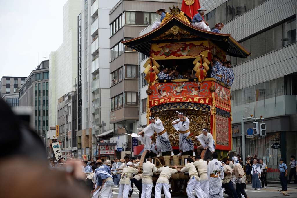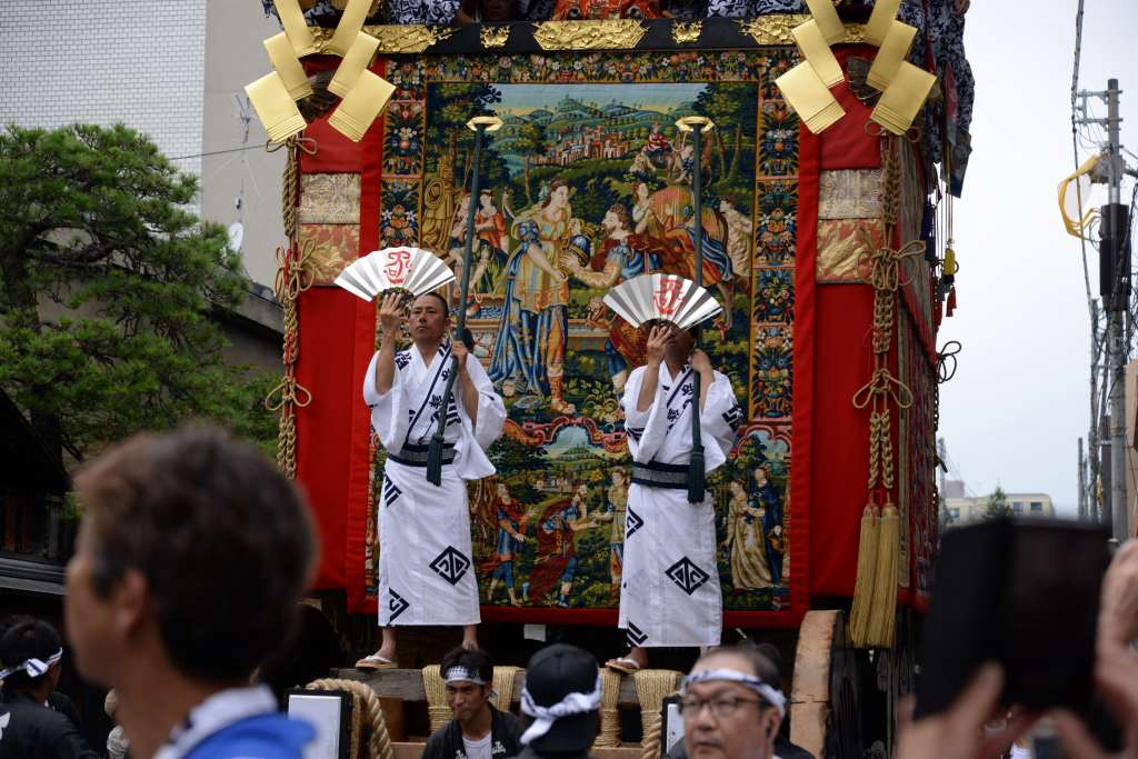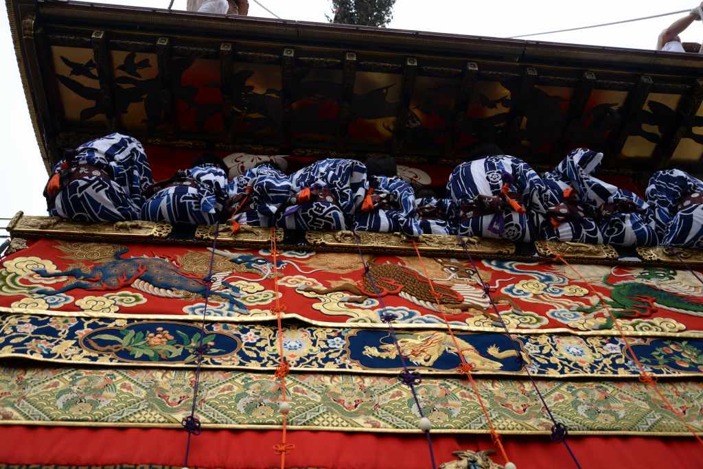 〜 24日(後祭巡行) 〜 7月24日は後祭の巡行です。 今年は日曜日であり、テレビでも中継されていましたが、やはり出かけて本物の巡行を見ることにしました。 四条の新町辺りで鉾が帰ってくるところを狙いました。ちょうど北観音山が辻回しをしているところでした。 車輪の下に竹を引いて、水を掛け大きな掛け声とともに気合をあわせて90度回します。 1回では回りきらずに何回も分けて鉾の方向を変えます。やっと思う方向へ舵を切り、狭い新町通りに鉾は消えてゆきます。 続いて、南観音山と大船鉾が続きます。いずれも新町通りに消えてゆきます。大きな鉾が狭い通りに消えてゆくところが何とも 奇異に感じます。 これで後祭の巡行も終わりました。北、南観音山は所定の場所に戻って来ました。 鉾はすぐに解体されます。北観音山の解体現場をしばらく見ていました。 まず華麗な装飾類が外されます。次に大きな車輪が外され、大きな掛け声とともに民家の収容場に運ばれます。 荒縄でしっかり組まれた骨組が残ります。2日に渡って解体するようでした。 折角我々を楽しませてくれたのですが、あっけなく解体されるのを見ると「あわれ」さえ感じます。 これで今年の祗園祭はすべて終了しました。 |