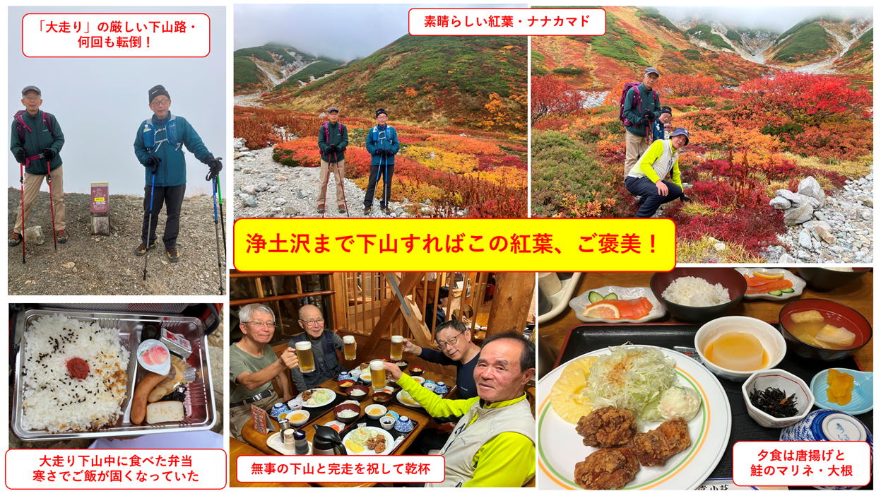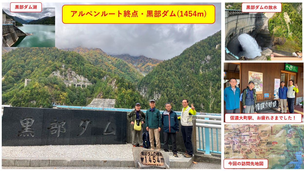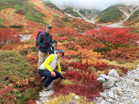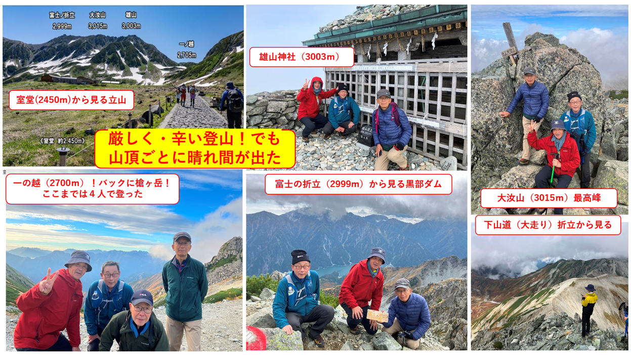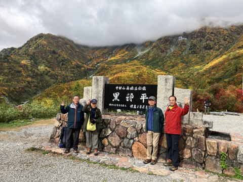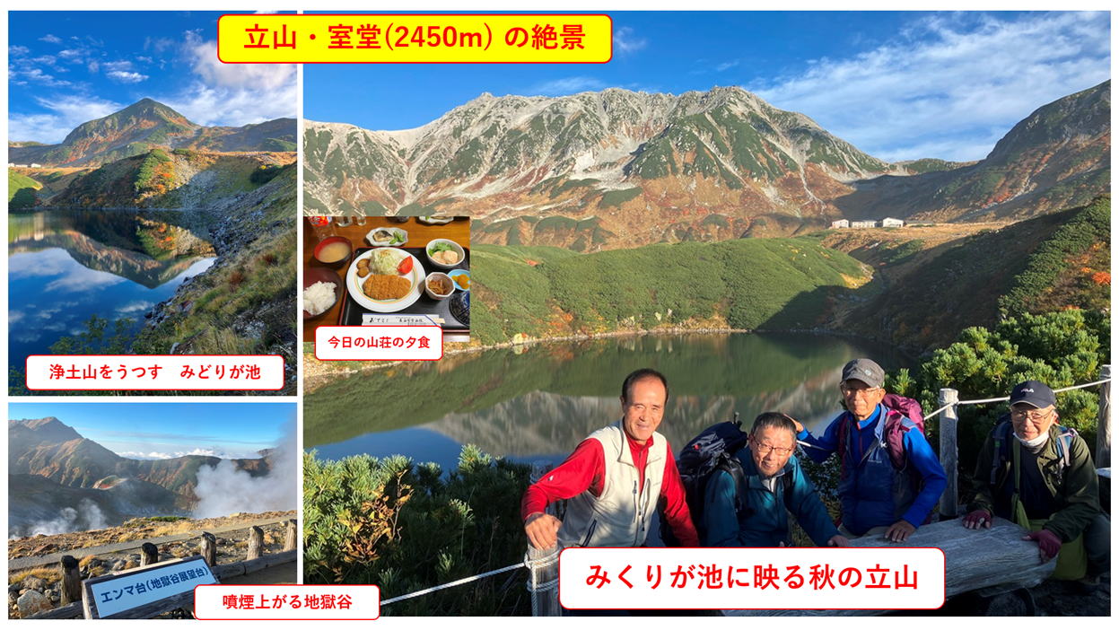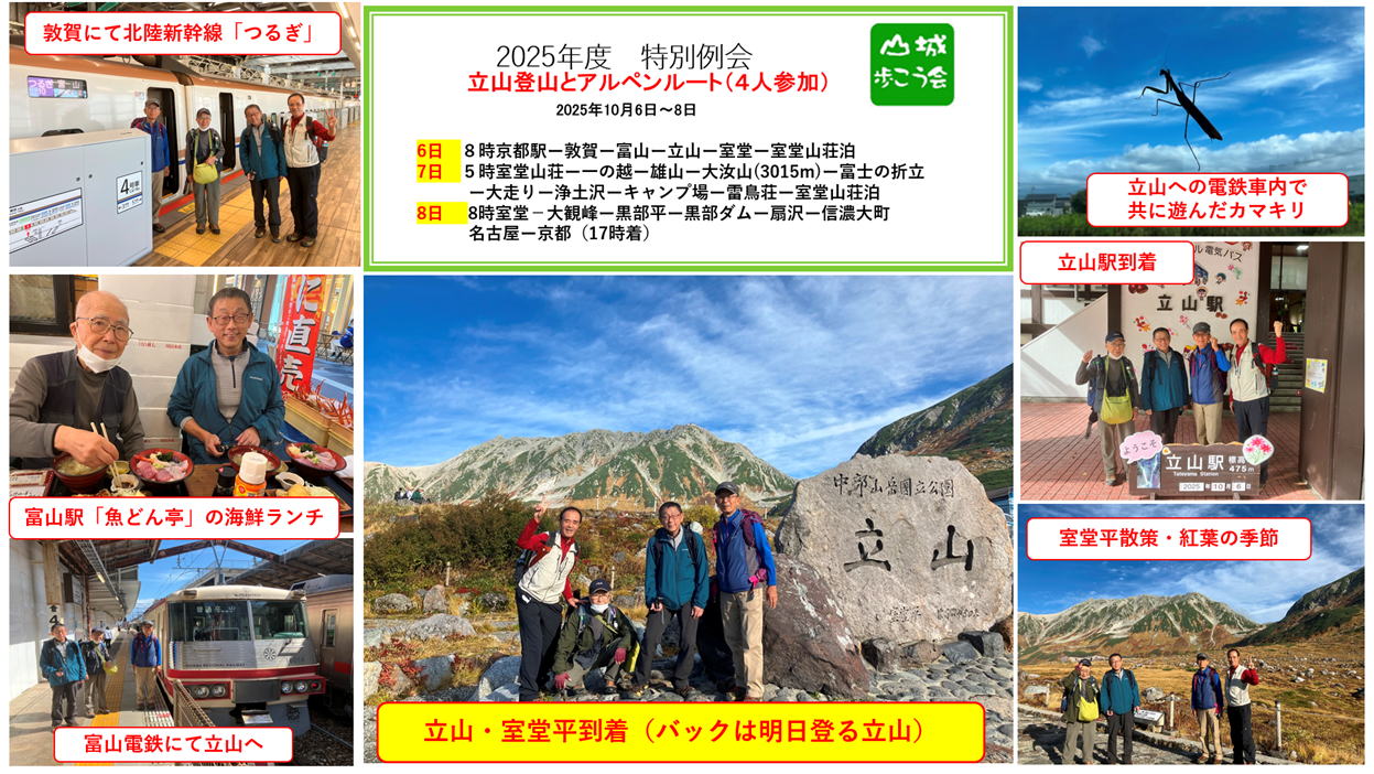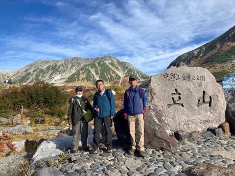 2025年10月6日から8日、2泊3日で、2025年度の特別例会・立山登山とアルペンルートに行ってきました。 今回は4人の参加者でしたが、全員無事に帰ってきました。1日目は北陸線富山から立山に入り、標高2450mの室堂まで アルペンルートで移動し、室堂平を散策し、みくりが池や地獄谷を訪れ、室堂山荘に宿泊しました。 2日目は立山登山で標高3000mの雄山・大汝山・富士の折立の3山に登り、厳しい大走りの下山路を苦労しながら浄土沢 まで下りました。浄土沢の紅葉はとても素晴らしく癒されました。夜はみんなで無事の帰還に感謝して祝杯をあげました。 3日目はアルペンルートの黒部平・黒部ダムを訪問し其の景観や紅葉を肌で感じ、信濃大町から京都まで5時間の鉄道旅を 楽しみました。比較的お天気に恵まれ穏やかな秋の北アルプスを満喫しました。 |