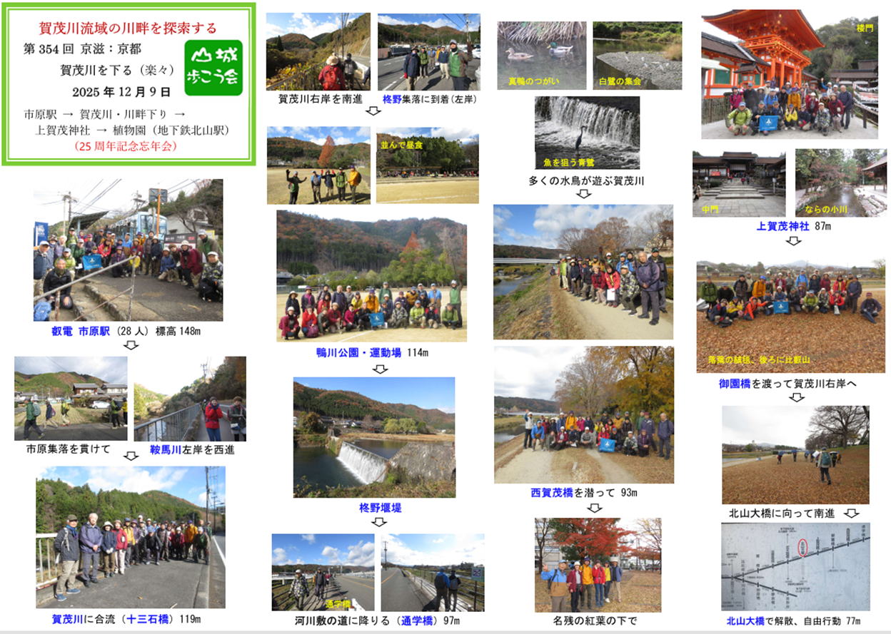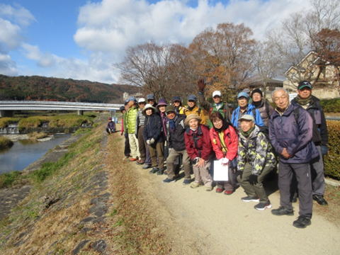 | 12月9日(晴時々細雨)、朝方の冷えは日が昇るとともに解消され、叡電市原駅には28人が集合。 今回は、市原駅から集落を通り鞍馬川沿いを西に向い、十三石橋で賀茂川に合流して以後は川沿いをひたす ら南下し、植物園(地下鉄北山駅)に至る高低差70m・距離7.4kmの平坦な行程です。 川の上流部の谷間では 舗道を歩きましたが、上賀茂の通学橋の袂からはここから始まる河川敷の道に下りて終点まで歩きました。 上賀茂の柊野堰堤を過ぎると流れはゆったりとなり、数多くの鴨や鷺が水面で遊ぶ様や、周りの植栽の落葉の 様を愛でながら、車の喧騒も届かない、穏やかな時間を過ごすことができました。 ※計画変更あり:途中の北山大橋で自由解散をし、各自で忘年会会場に向うことになりました。 |