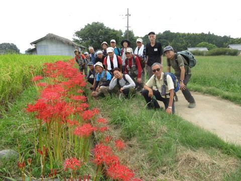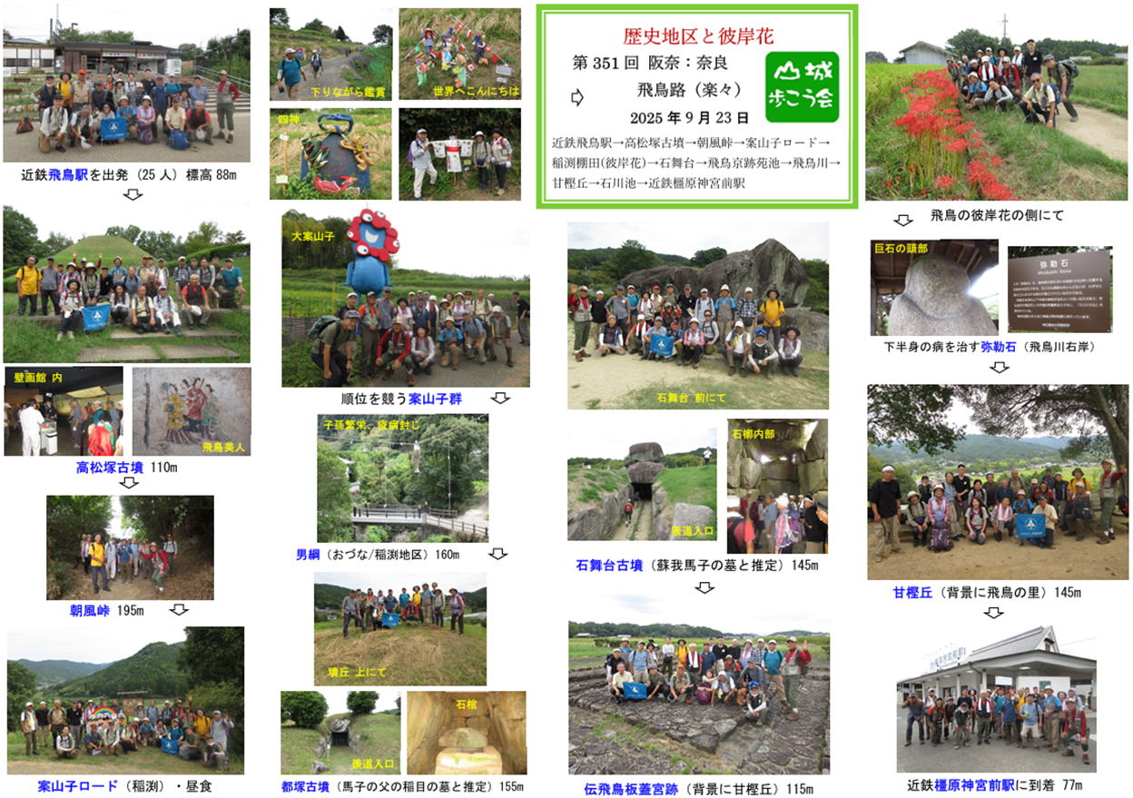 9月23日・秋分の日(薄曇)、気温・湿度が下がってやっと秋模様となり、近鉄飛鳥駅には25人が集合。 行程は、近鉄飛鳥駅から高松塚古墳を経て朝風峠を越え、稲渕・石舞台・甘樫丘など飛鳥の地を巡り、近鉄橿原神宮前駅に 至る約10kmです。途中、高松塚古墳壁画館・石舞台では、実際に入場して遺跡を詳しく鑑賞することができました。 久々に快適な環境下で歩くことができ、皆さん気分も身体もリフレッシュできたのではないかと思います。 |