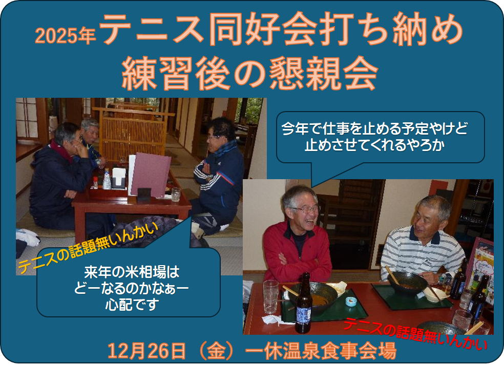 懇親会の後一休温泉につかり1年間のテニスに思いをはせ、家路につきました