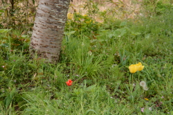 ![]() チューリップと八重桜をバックに今日最初の集合写真 |