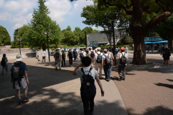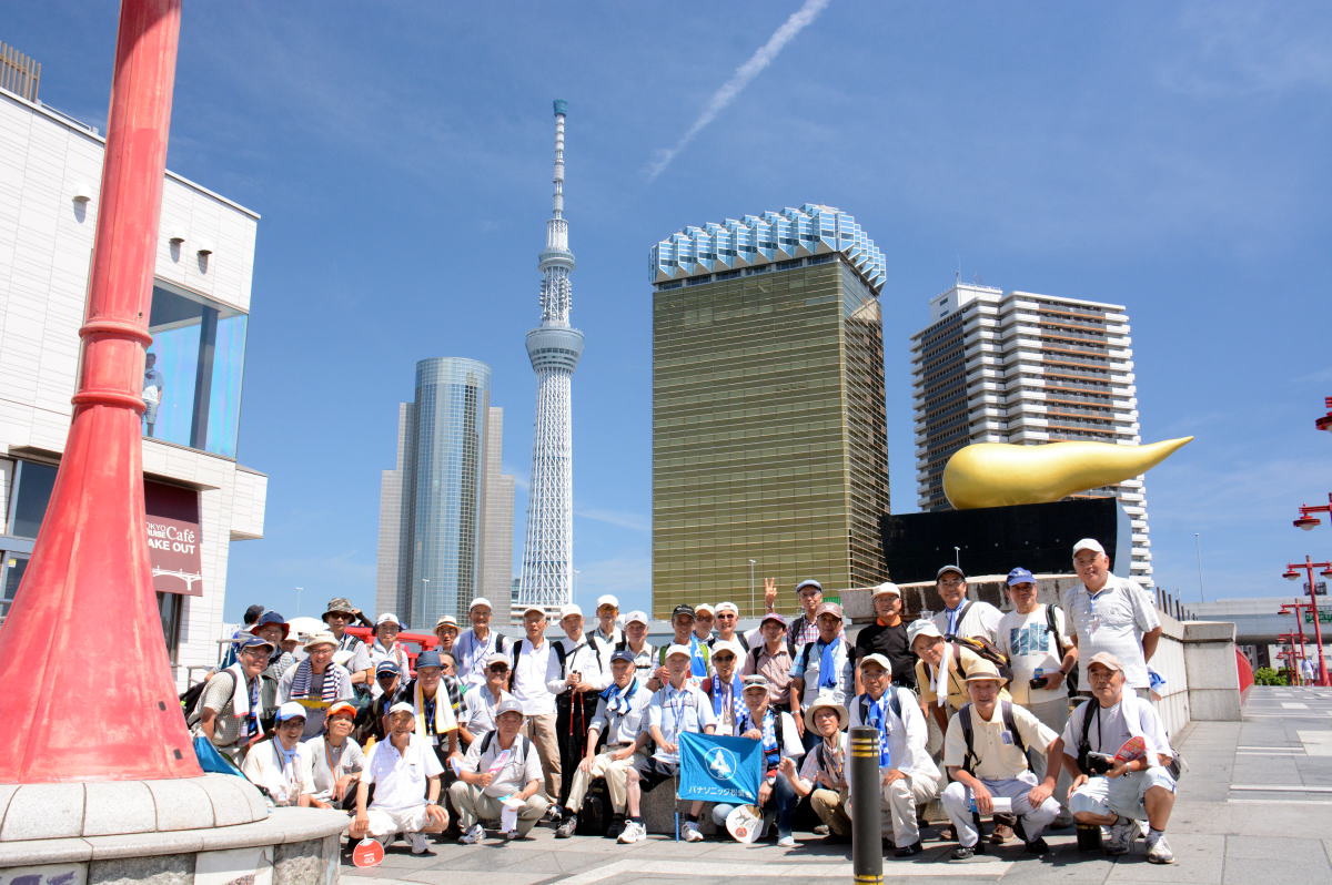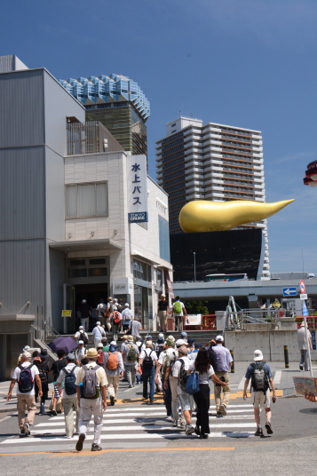 ![]() 猛暑の中、浅草新名所をバックに記念写真 |