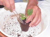 苗の頂部に培養土等を掛けない様、注意深い扱いを知って貰った。