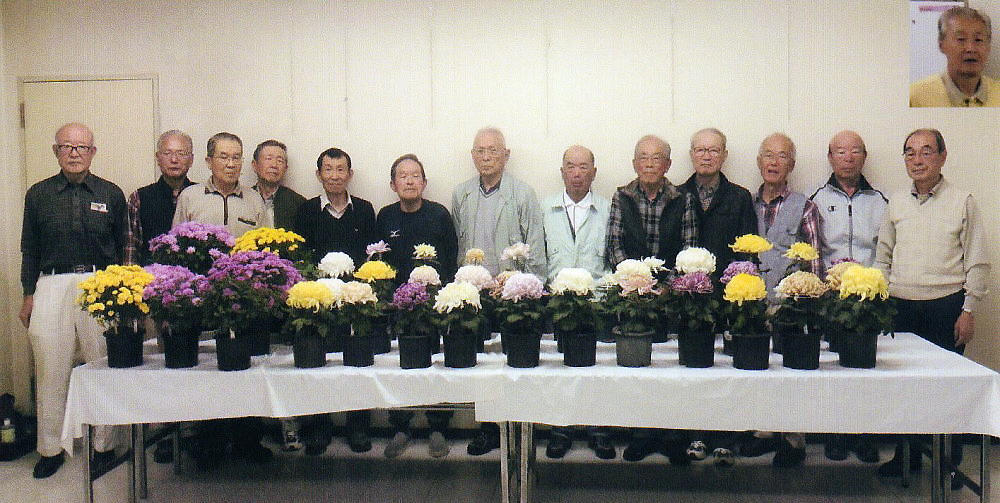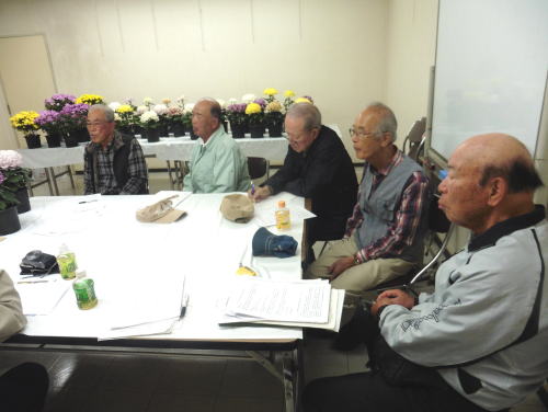 ・1年の成果の福助菊35鉢、ざる菊2鉢、ドーム菊5鉢が持ち寄られた。